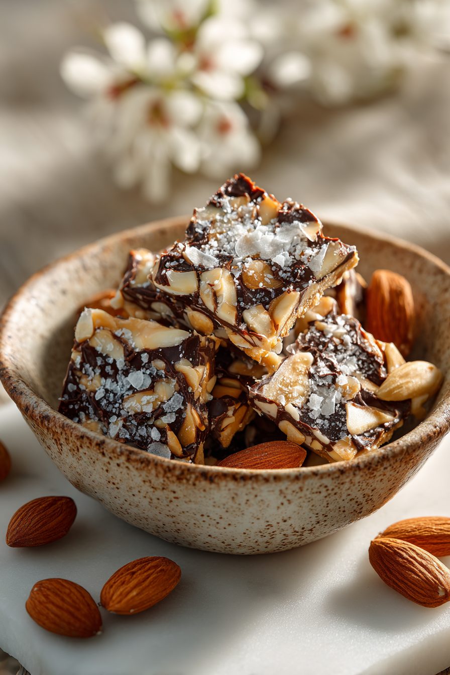 - Sprinkle sliced almonds over the chocolate and finish with flaky salt. Gently press to adhere.