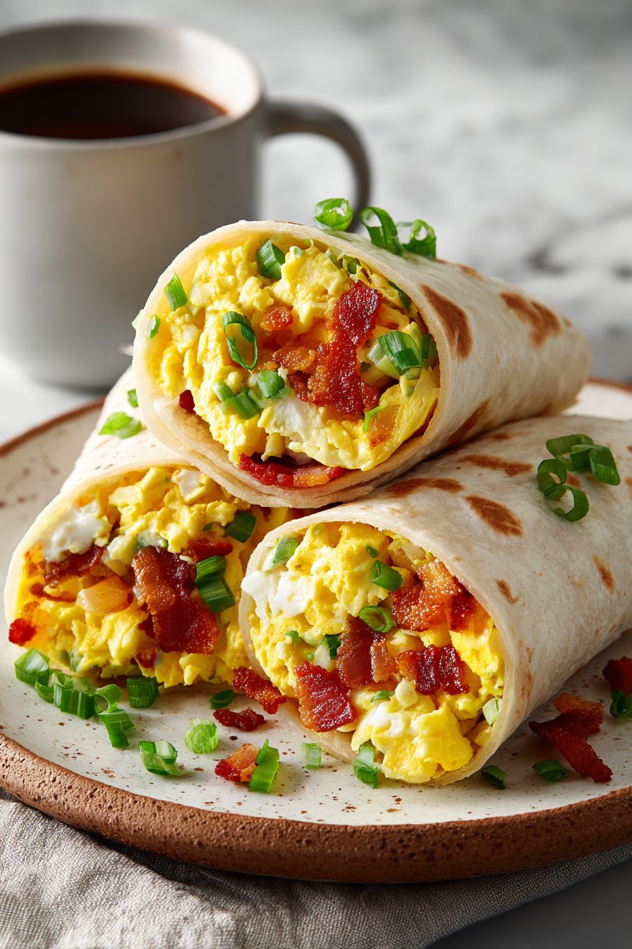 - Fill each tortilla with cheese, scrambled eggs, crumbled bacon, and green onions. Roll tightly, tucking in the sides.