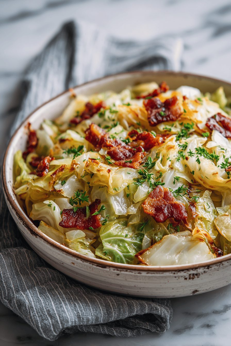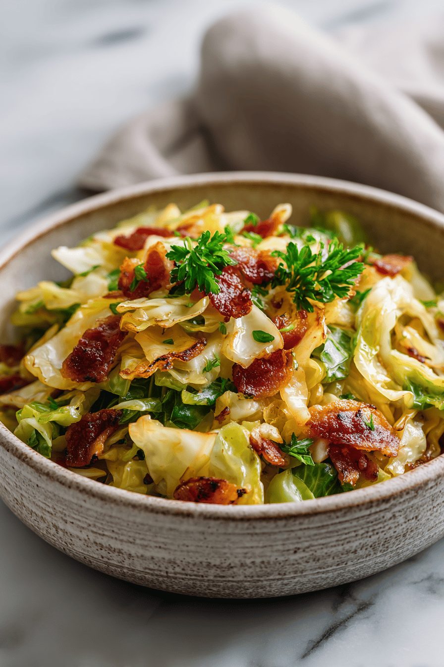 My husband calls this “the cabbage that saved dinner.” No joke — there have been many evenings where he walks in starving and leaves carrying a Tupperware of leftovers like it’s treasure. The kids, who are suspicious of anything green, will happily pick out the bacon and then, mysteriously, eat the cabbage too. I started making it when we were broke and busy, and now it’s one of those recipes I turn to when I want to impress without panicking.