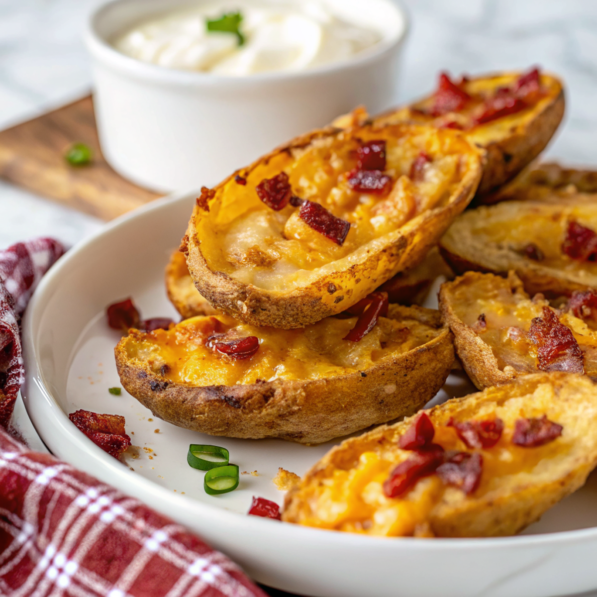 I’m not gonna lie: these baked potato skins are the kind of snack that makes the whole house smell like comfort and slightly guilty pleasure. Crispy potato shells loaded with melty cheese, scallions, and whatever crunchy, salty bits you’re hoarding in the fridge — they’re loud, cozy, and impossible to eat just one of.