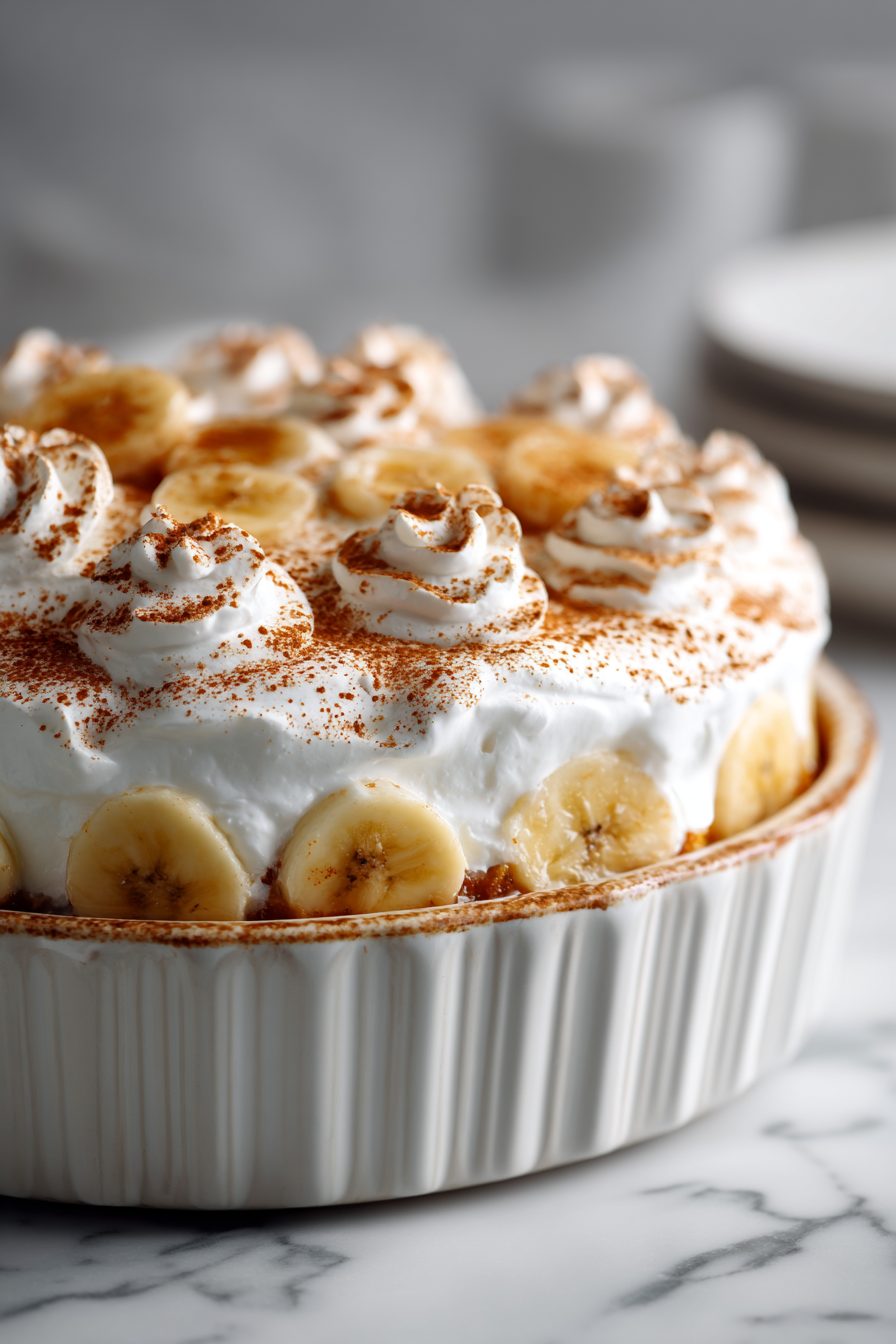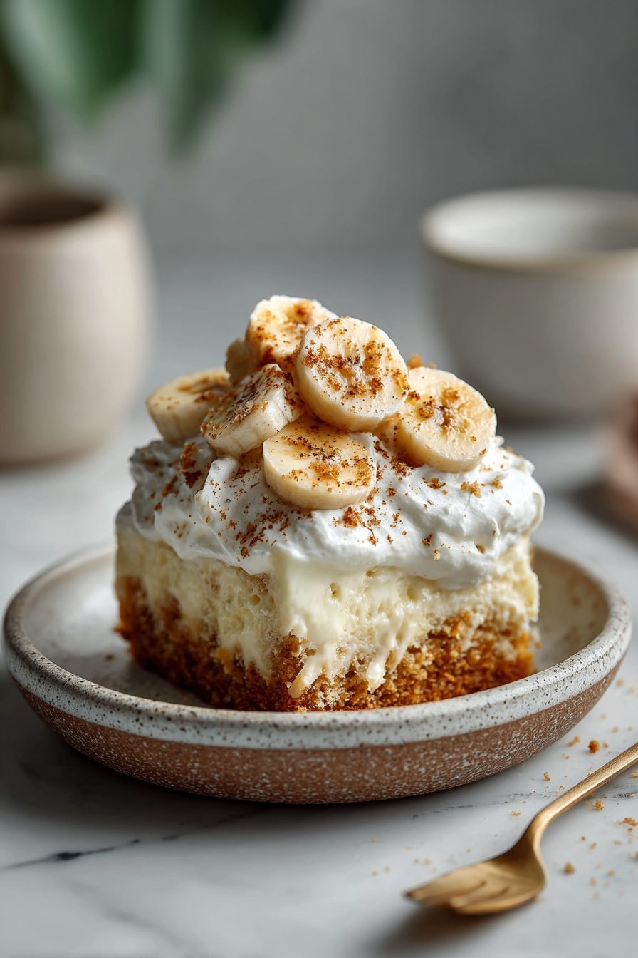 This cake is where I learned to be okay with messy things. The first time I tried poking a cake, I stabbed it like I was mediating a tiny feud and made too many holes — the top turned into a pudding swamp. Now I poke in a grid and call it meditative. Also, don’t slice the bananas too early unless you like brown sadness; I slice just before assembly or toss them in a little lemon juice if they need to wait. Once I accidentally used instant banana-flavored pudding and the kids declared it “banana candy” (they were not wrong), but I prefer classic vanilla or banana pudding for balance.