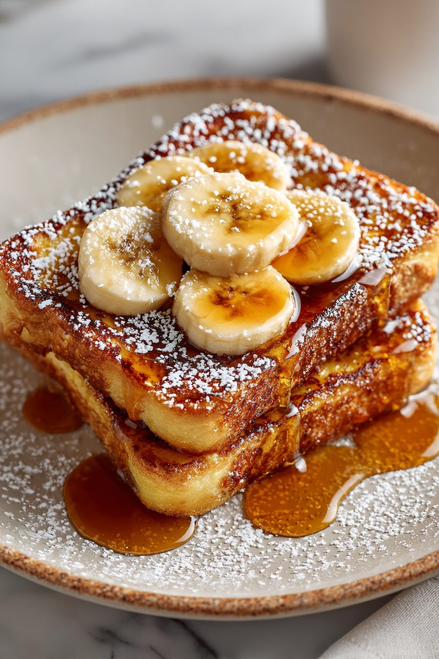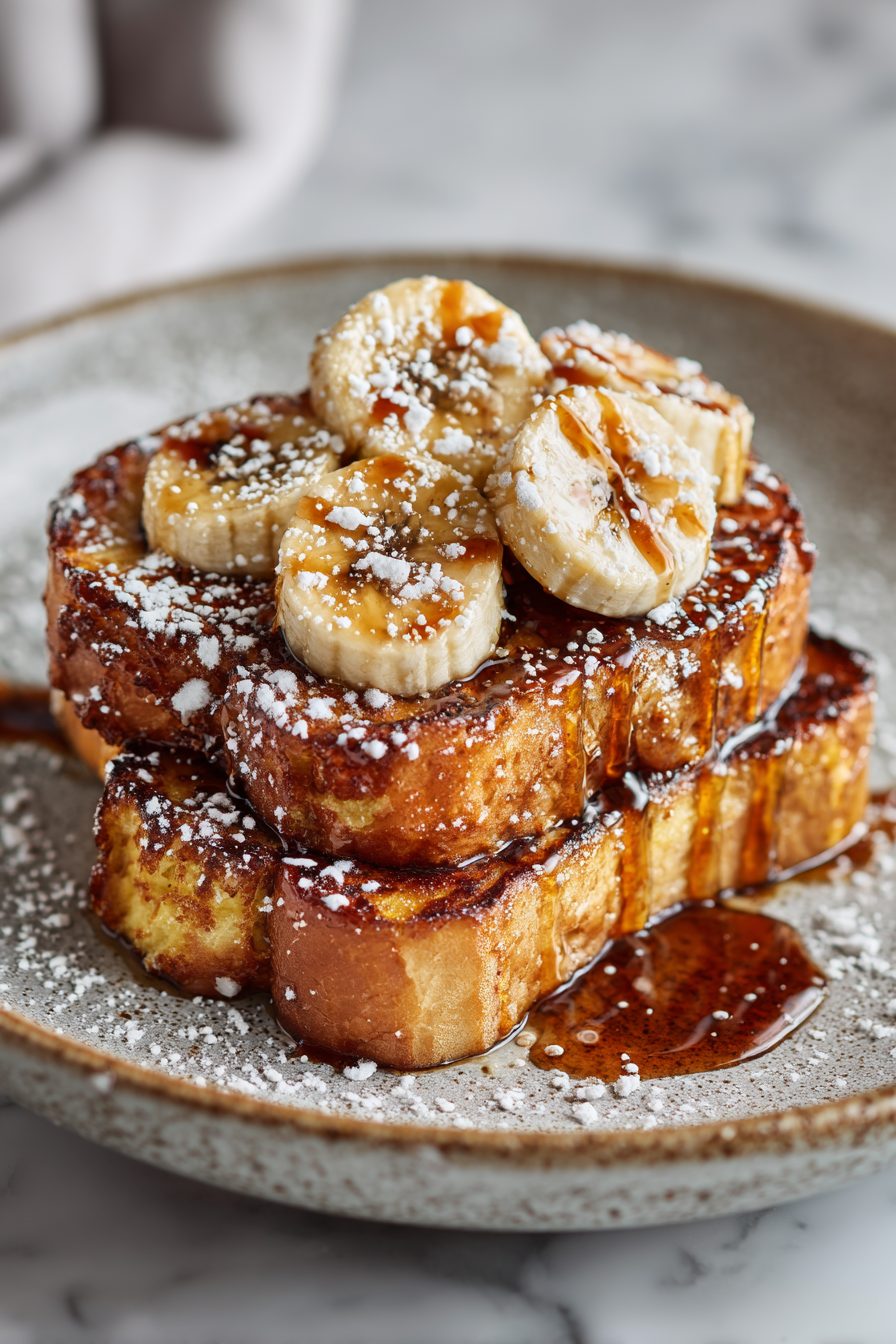 - Plate the French toast. Spoon warm banana-rum sauce over the top and dust with powdered sugar. Serve immediately.