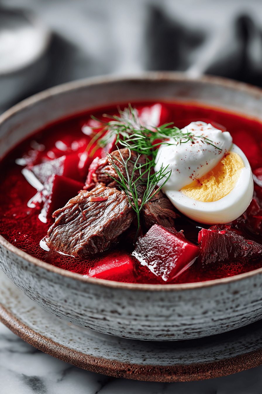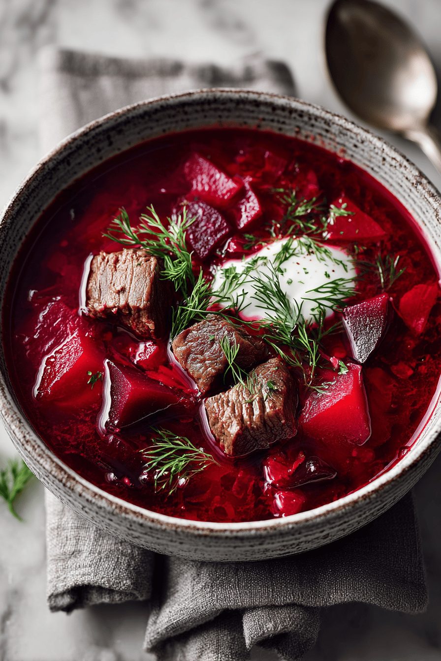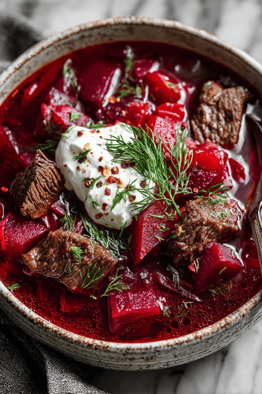 This soup is the kind I make when I want something that feels like a giant, cozy hug in a bowl: chunky beef, sweet earthy beets, bright vinegar, and a dollop of sour cream that melts into silky goodness. It’s heady and simple at once — classic Eastern European borscht but with a beefy backbone that turns it into dinner. If you like deep, comforting broths with a little tang and bright color, you’ll get why I keep making this on repeat.