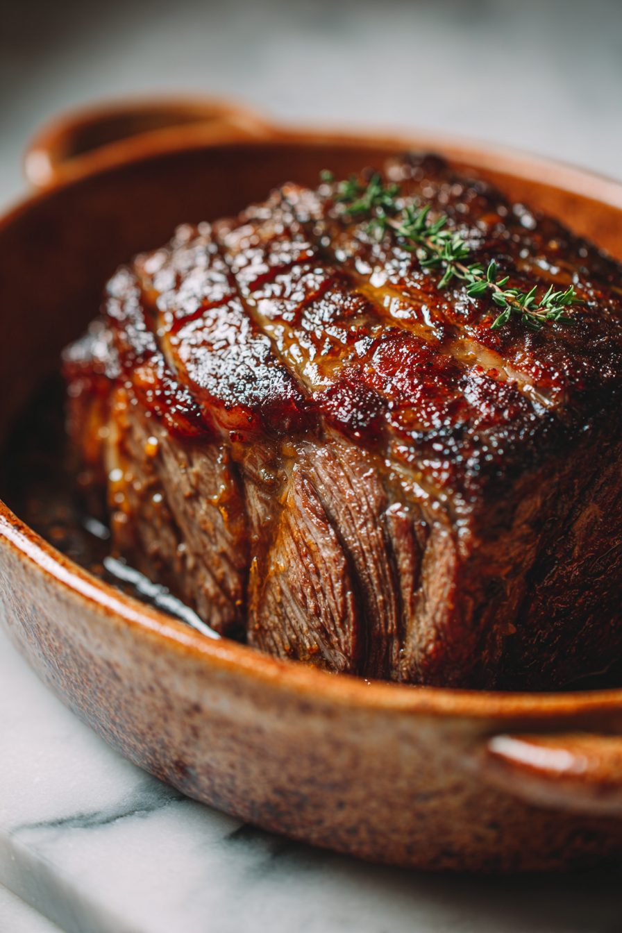 There’s a very specific kind of quiet that happens when a beef roast is doing its slow, low magic—like the house sighs a little and everyone just softens around the edges. This one is cozy-but-fancy: richly seared beef tucked into a Dutch oven with onions, garlic, and a handful of herbs, then roasted until it relaxes into tender, slice-or-shred territory. The drippings become a glossy little gravy that makes you feel like you know what you’re doing, even if you threw it together in sweatpants with a baby wipe stuck to your sock.