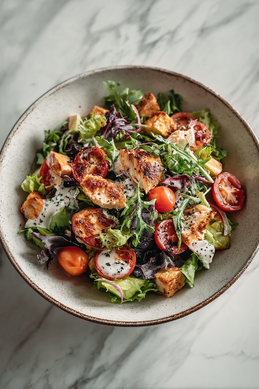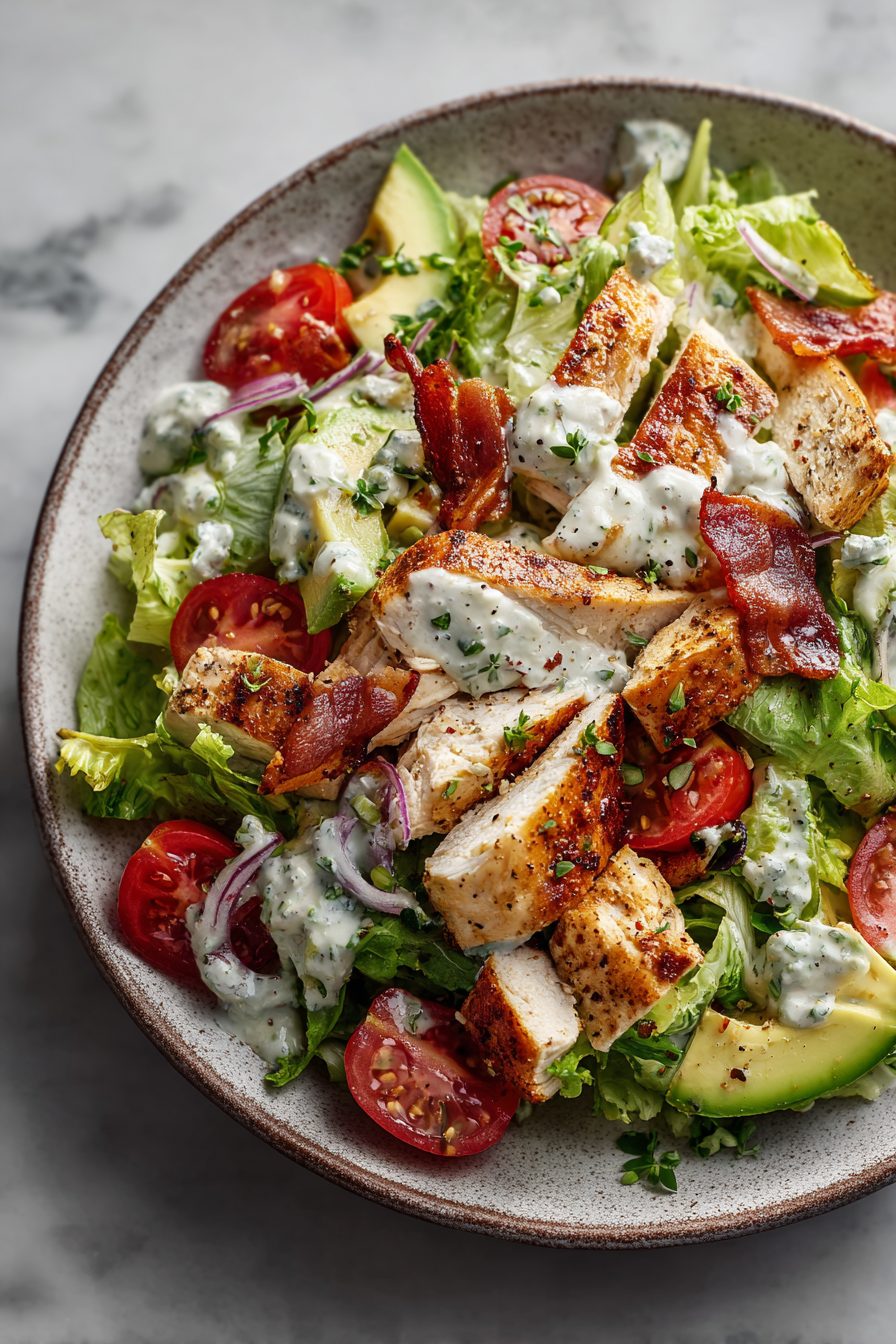 This salad is the messy, crunchy, smoky cousin of boring lunch salads — all the BLT vibes with actual chicken so it fills you up and keeps you from daydreaming about pizza by 3 p.m. Crisp bacon, juicy tomatoes, shredded chicken, crunchy greens, and a tangy mayo-ish dressing that somehow tastes like summer in a bowl. Try it because it’s fast, forgiving, and makes you feel like you made something fanciful even when you’re half-asleep on a Tuesday.