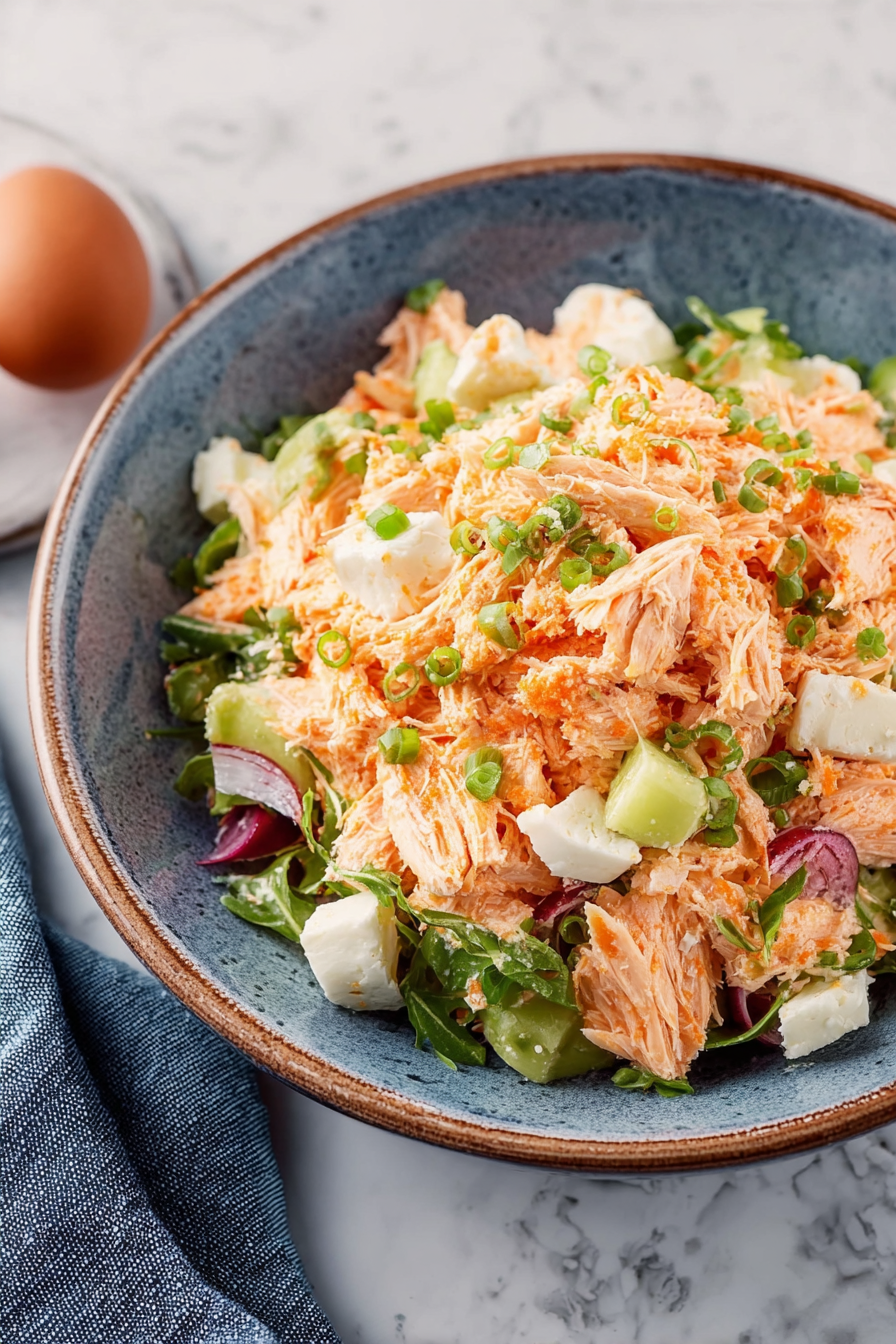 This salad is my version of messy, spicy comfort in a bowl — shredded or chopped chicken tossed in tangy buffalo sauce, crisp greens, celery crunch, a creamy blue-cheese or ranch drizzle, and whatever pickled thing I forgot to buy but somehow works. It’s bright, a little naughty, and perfect for when you want something that feels like takeout but doesn’t require carrying guilt or a wallet.