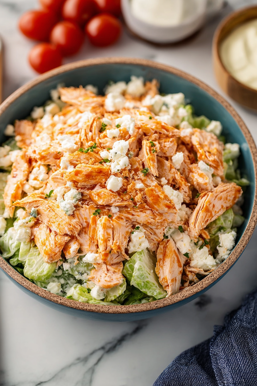 My husband is absolutely obsessed with this. He’ll text me from the couch, “Make the buffalo salad tonight?” like it’s a magic spell. The kids will eat the chicken and pick around the blue cheese, then come back for the crunchy bits. Once I accidentally used hot wing sauce that was way too hot — we ate it anyway, tears and all — and now it’s “The Fire Night” in family legend. It’s become our go-to weeknight dinner and also the dish I bring to potlucks when I want to look like I tried.