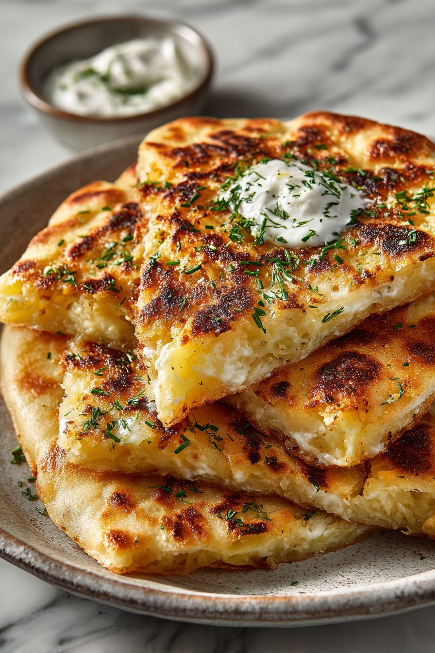 This cheese-and-potato flatbread is one of those gloriously lazy, slightly greasy, utterly comforting things that feels fancy but is mostly smoke-and-mirrors. Thin, crisp flatbread topped with paper-thin potato slices, melty cheese, a hit of garlic, and whatever herbs are hanging around — it’s simple, snackable, and perfect when you want something cozy without an hour of drama.