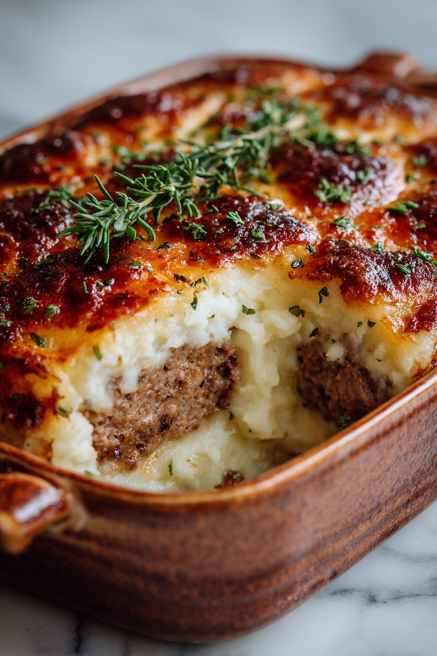 I’ve tried this with both a straight-up beef situation and a half-and-half beef/pork mix. The pork adds a little juiciness—like your meatloaf moisturized. If your mashed potatoes feel a bit stiff before you spread them, splash in a little warm milk so you can swoop them like frosting. I once got wild and used pepper jack inside—10/10 spice kick, 6/10 for kid approval. Another time I swapped ketchup for a tangy BBQ glaze, and we all stared at each other like, well that works. If your casserole dish is shallow, put it on a sheet pan because boil-overs are dramatic and honestly I’ve met my smoke alarm enough times this year.