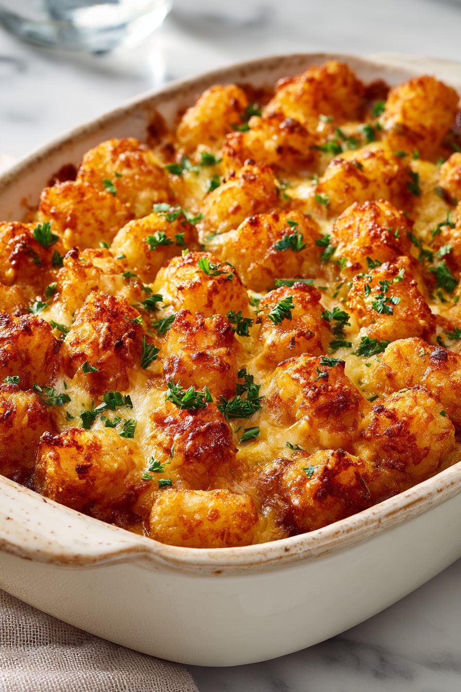 Serving/Storage: Serve with a crisp salad or steamed greens. Refrigerate leftovers up to 4 days; reheat in the oven or air fryer to re-crisp the tots. Assemble ahead and chill up to 24 hours before baking.