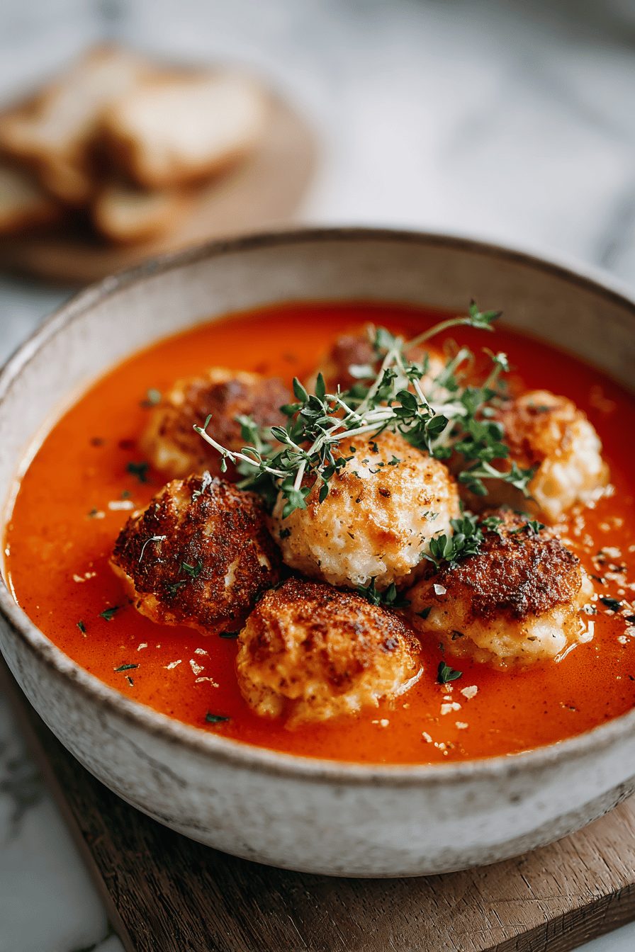 This soup is one of those ridiculous comforts — tangy tomato broth, melty cheese, and little pillowy dumplings that soak up all the goodness. It skirts the line between stew and cozy pasta night, and it somehow makes leftovers taste like you worked all afternoon when really you hustled it together between homework and emails.