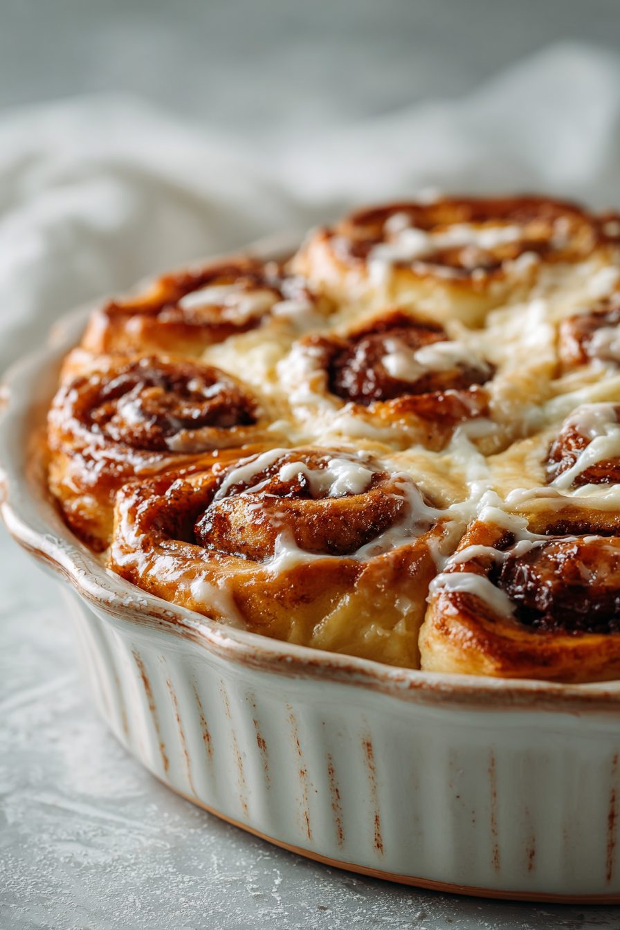 I’ll be honest: the first time I made this I used three different pans by accident (long story involving a toddler and a missing 9×13). It didn’t matter — the casserole still turned out amazing. I’ve swapped canned for homemade, and both are lovely; canned rolls give you that uniform gooeyness and a little less clean-up. Also, don’t skip the extra butter on top — it makes the crust into golden pockets of caramelized goodness. If you want it less sweet, toss in a touch less icing or dribble it on while serving instead of before baking.