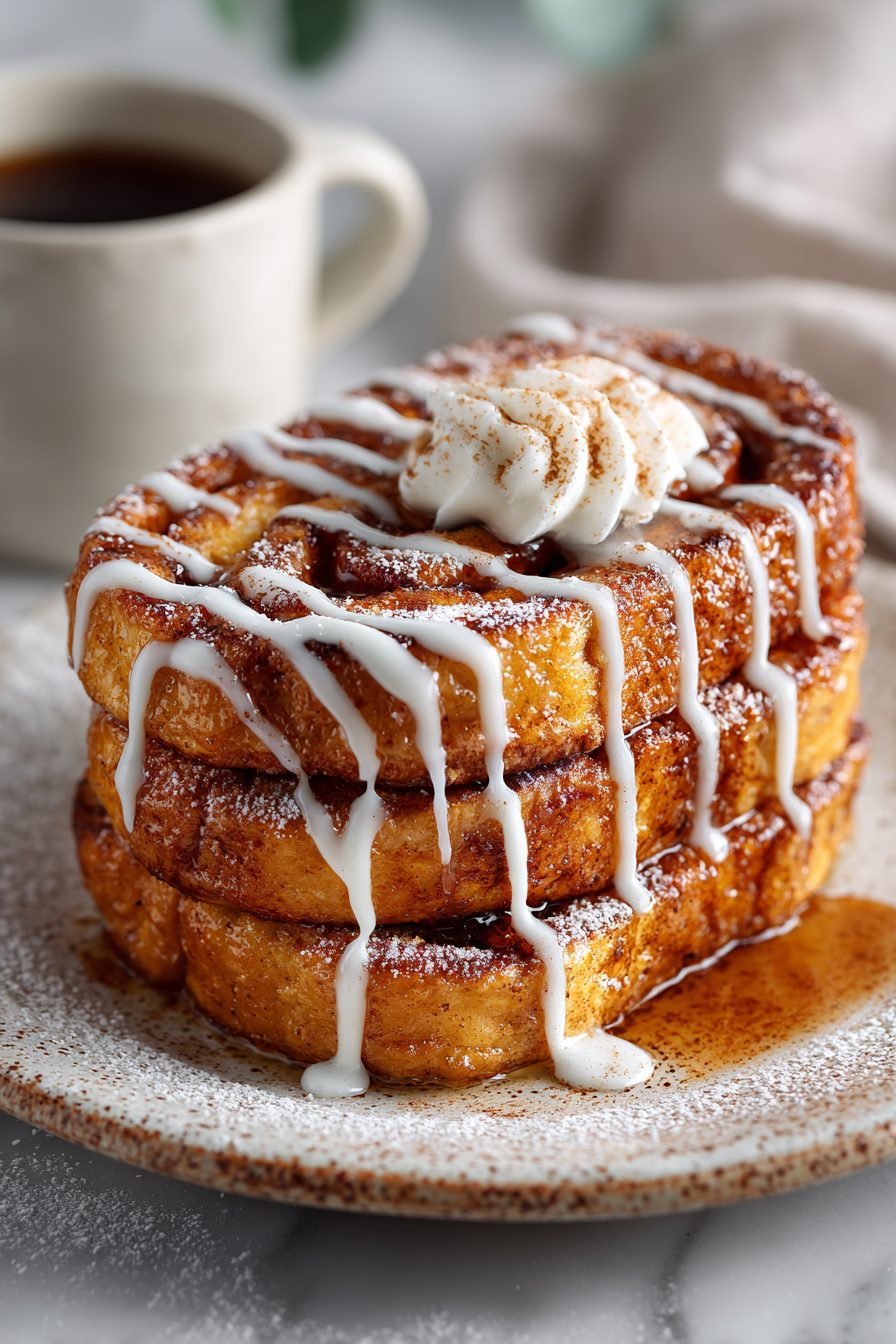 This thing is pure weekend-level chaos in the best way: cinnamon rolls dunked in a vanilla-egg custard, fried until pillowy, then drizzled with extra glaze so no one ever says “that’s dry.” It’s part French toast, part dessert, and 100% comfort — perfect when you want to feel fancy but also lazy.