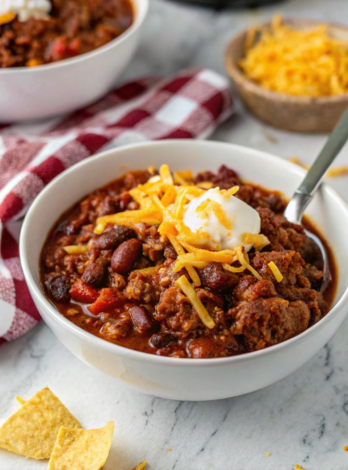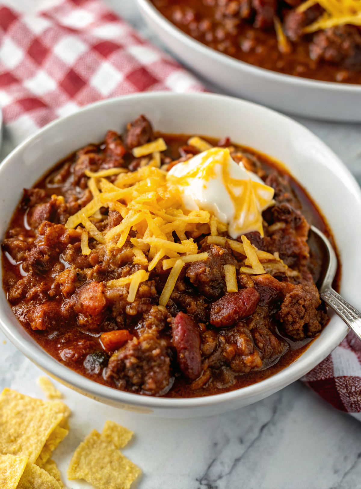 This chili is the kind of bowl that makes you sigh and then text your neighbor to come over because you’ve gone and made something seriously comforting. It’s a classic beef chili—rich, tomatoey, slightly smoky, with browned beef and beans (if you’re into that), and enough personality to show up to any weeknight dinner, potluck, or game day and steal the show.