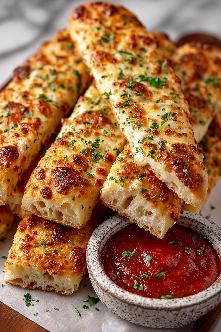 My husband calls them “therapy sticks” because after a long day he’ll stroll in, take one bite and instantly calm down. The kids learned to dip like tiny professionals. Once, I tried to be fancy and added rosemary — huge hit — but also once I forgot to brush them with butter and the gang staged a mild revolt. Now they’re our Friday-night ritual: cheese pizza, bad jokes, and a tray of these disappearing into happy mouths.