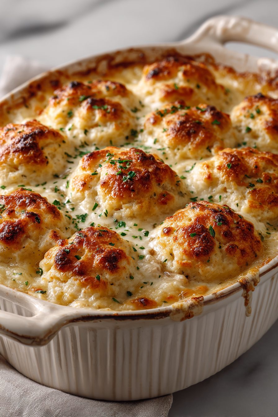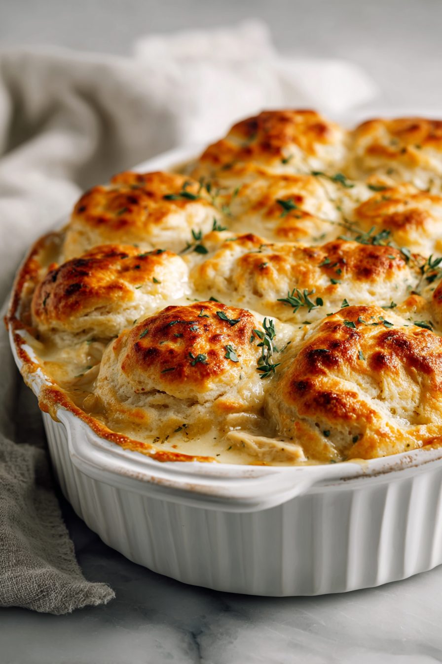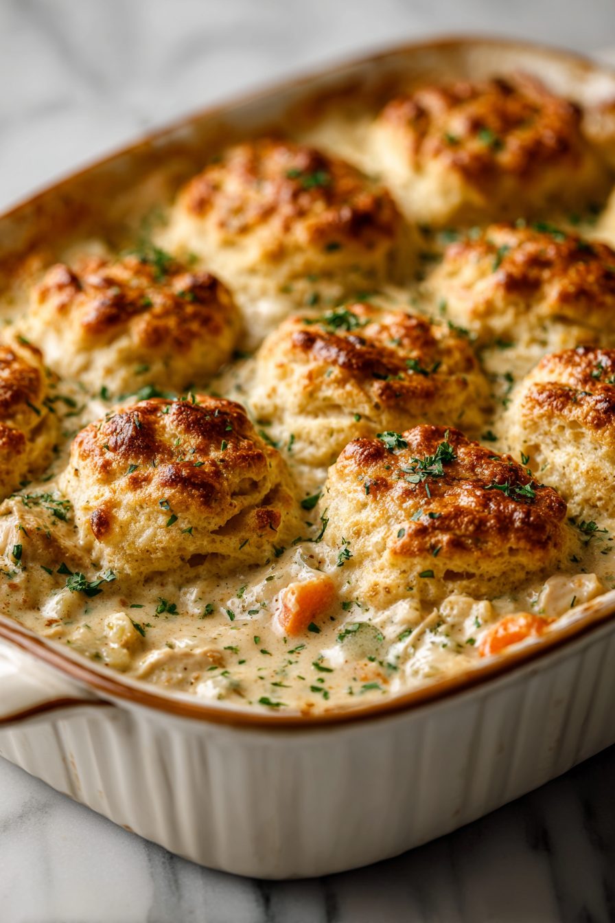 – It’s basically comfort in casserole form: creamy, savory, with buttery biscuit tops that brown like they mean it.