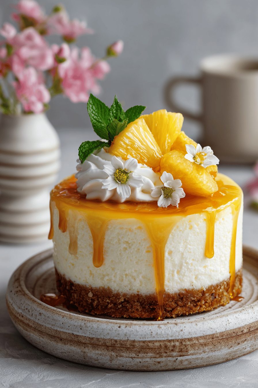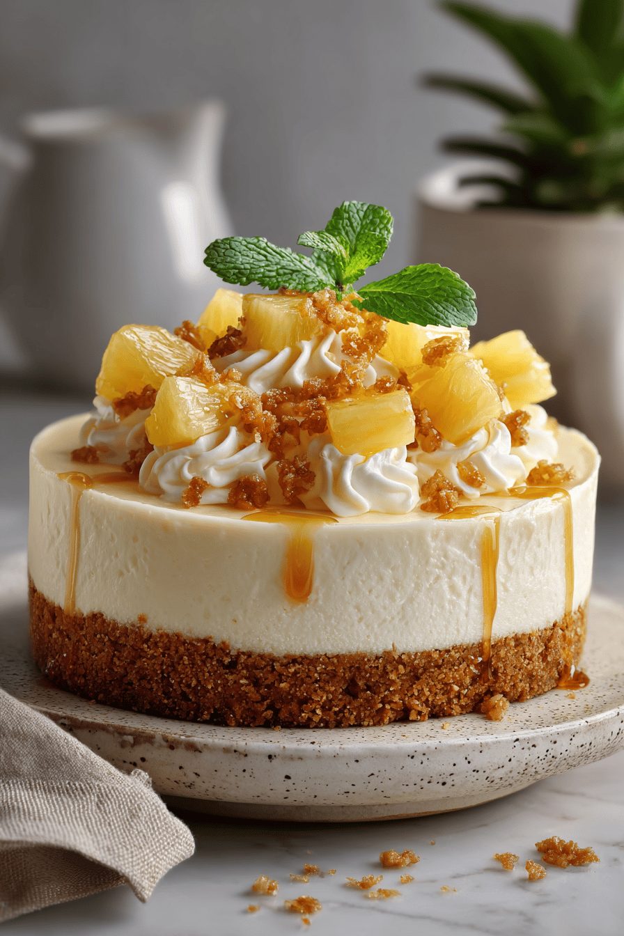 This cake is ridiculous in the best way — creamy, tangy, and studded with tender pineapple so it tastes like summer and dessert had a tiny sunlit baby. It’s a no-fuss-ish cheesecake that leans soft and spoonable rather than dense and fussy; think silky cream cheese filling, bright pineapple, and a buttery crust that soaks up some of those juices in the most comforting way.