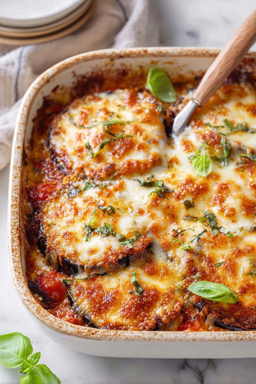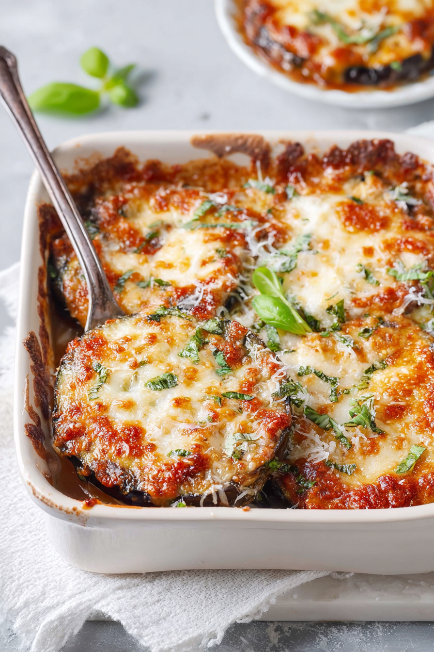 My husband calls this “lasagna with personality,” which is rude to lasagna but… fair. The kids try to sneak the crunchy corner pieces off the pan like they’re cookies. We once ate half the dish standing up at the counter, cooling it with frantic little blows between bites because nobody wanted to wait. It’s become our Sunday reset meal: playlists on, sauce simmering, eggplant slices lined up like little soldiers, everyone stealing mozzarella when they think I’m not looking.
