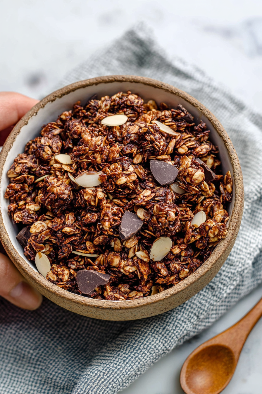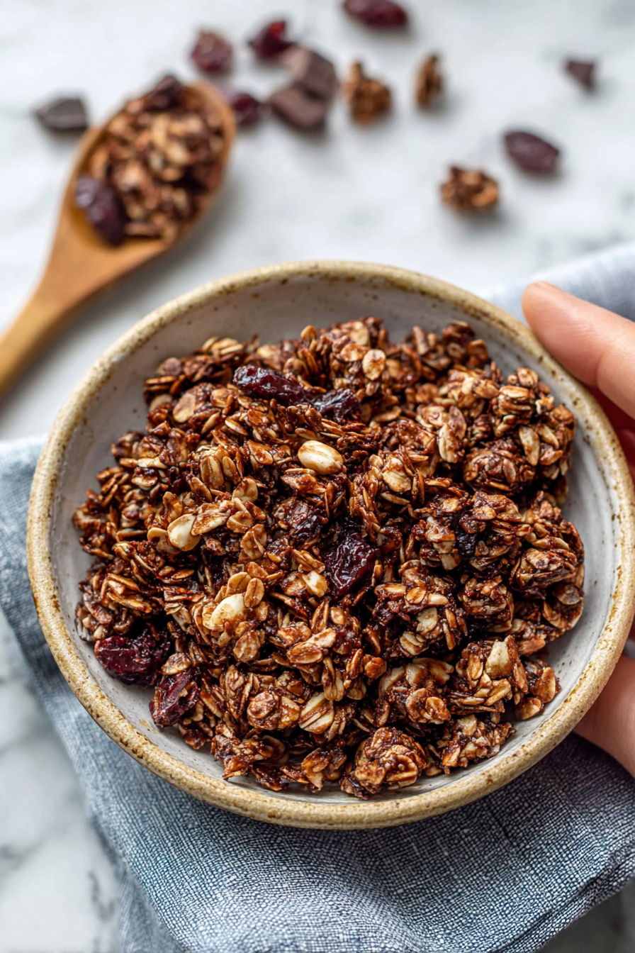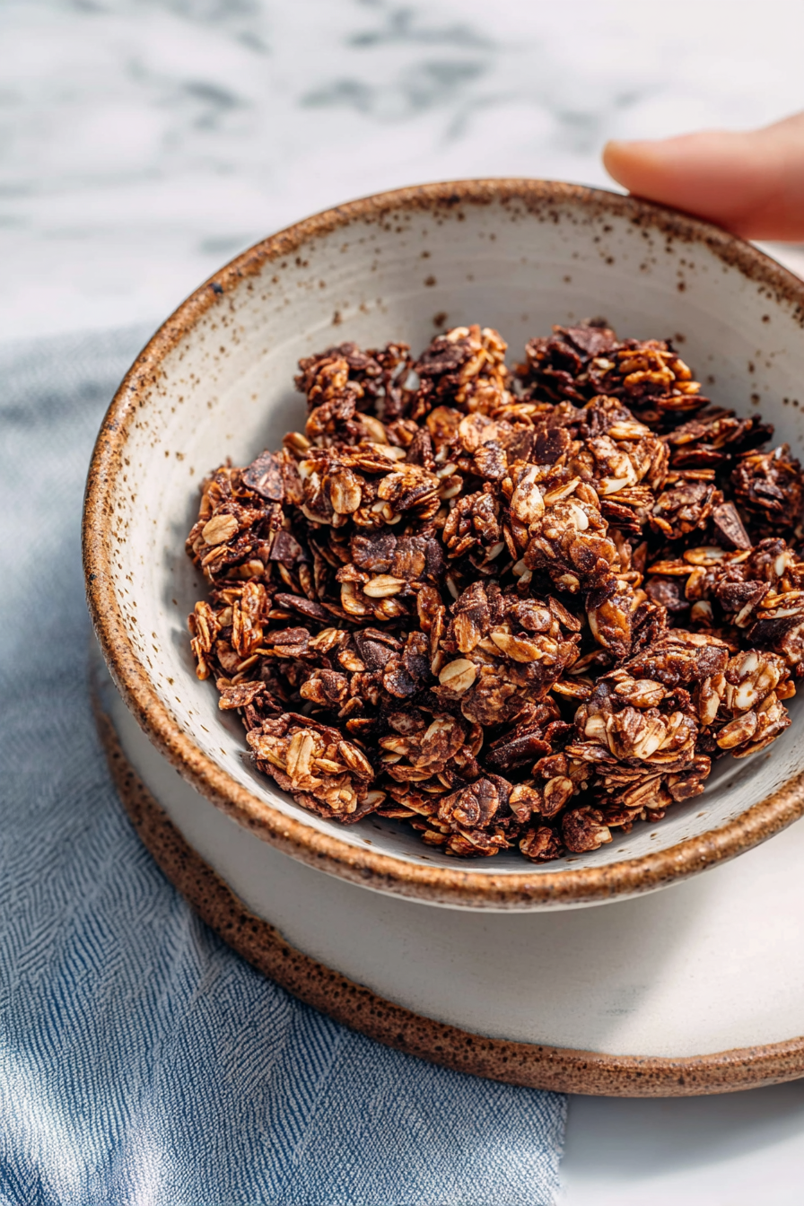 My husband calls it “breakfast candy,” which is how I know it’s dangerous. Our kid eats it like cereal (with milk, a face full of cocoa), my neighbor asked for the recipe and then showed up the next day with a jar she’d baked herself like we were secret granola club members. Once I tried adding espresso powder because I was tired and dramatic—don’t say I didn’t warn you, it’s a whole different mood, in the best way. This recipe lives on our countertop in a big mason jar and disappears faster than I can pretend I won’t eat the last handful.