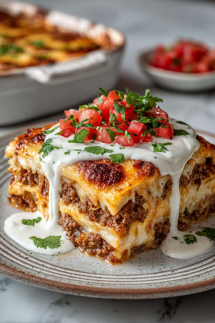 – It’s basically a layered hug: melty cheese, saucy filling, creamy top — all in one pan.