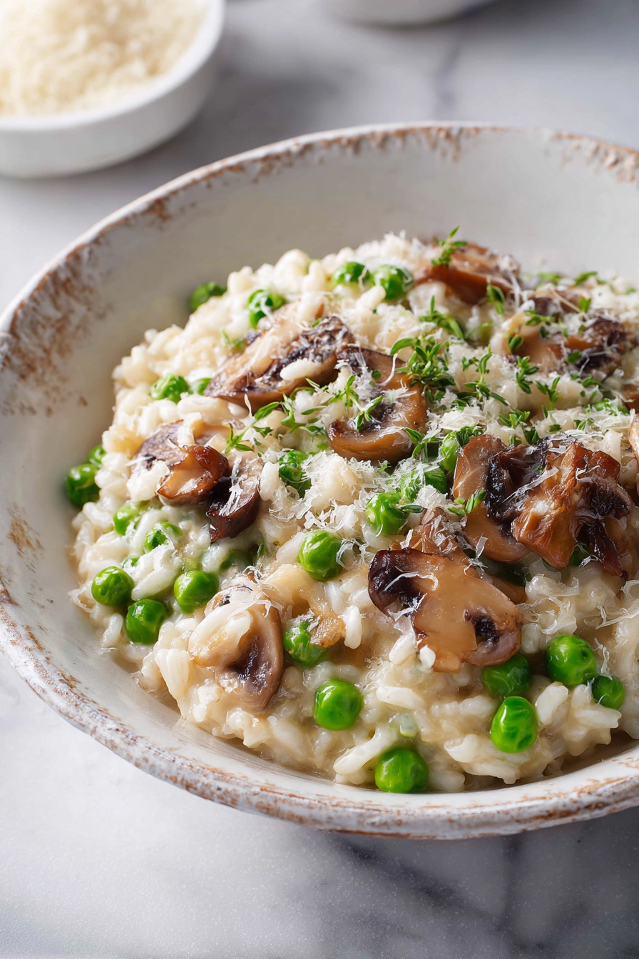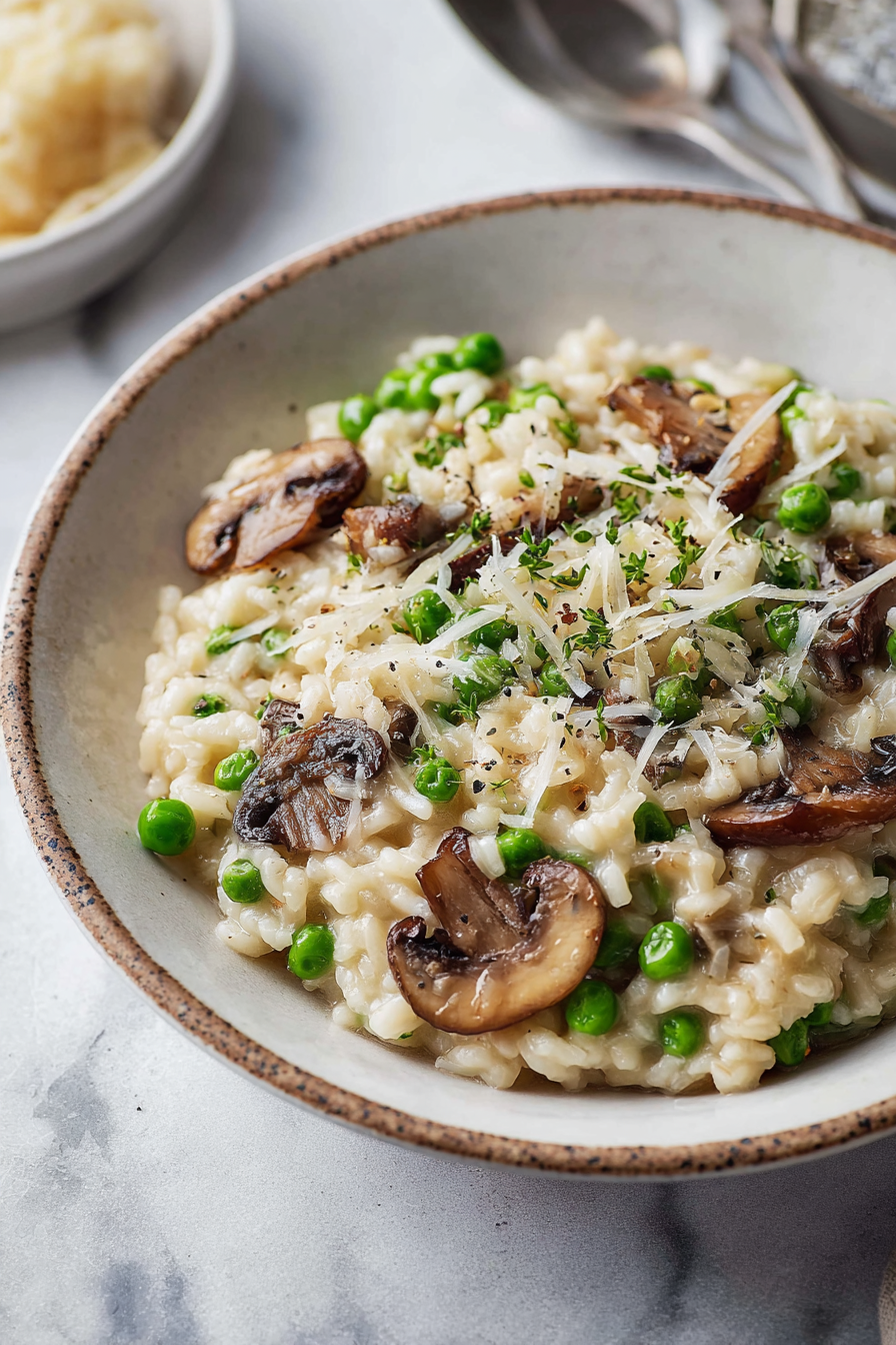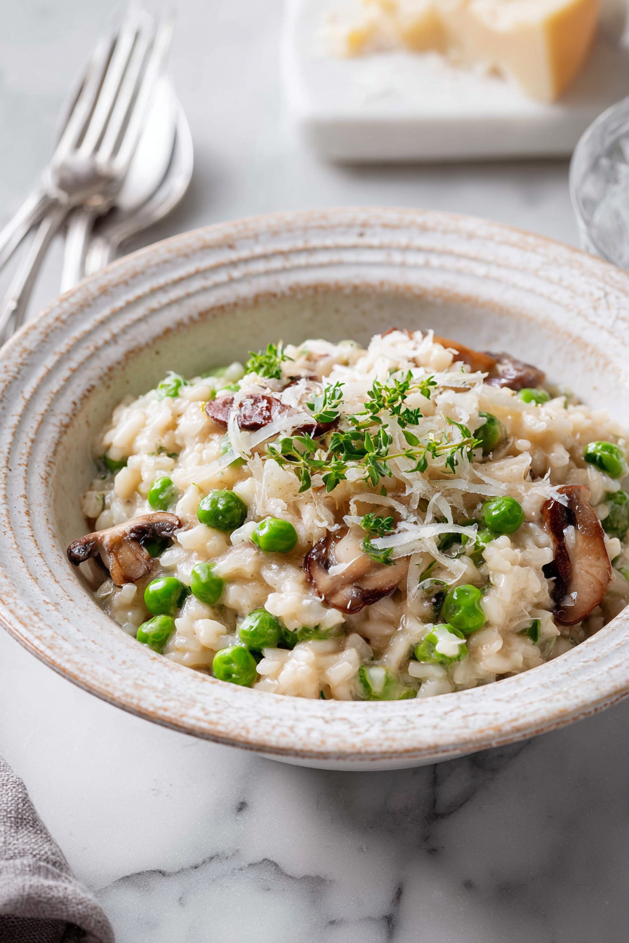 This risotto is my comfort food hero — creamy, slightly chewy arborio rice, earthy mushrooms, sweet little pops of peas, and a big kiss of Parmesan. It looks fancy but it’s one-pot cozy, which means dinner-night magic without an hour of panicked plating.