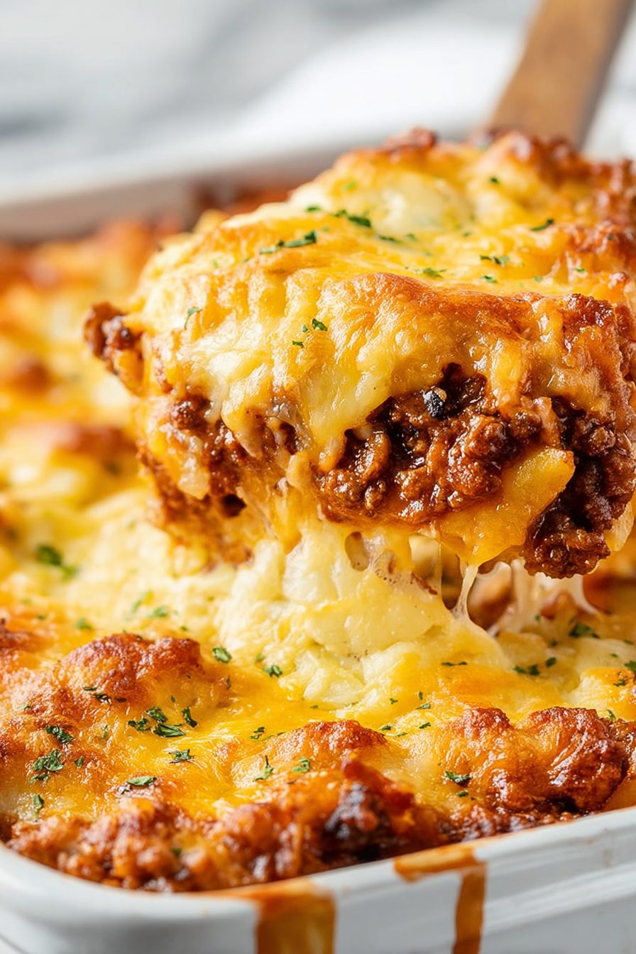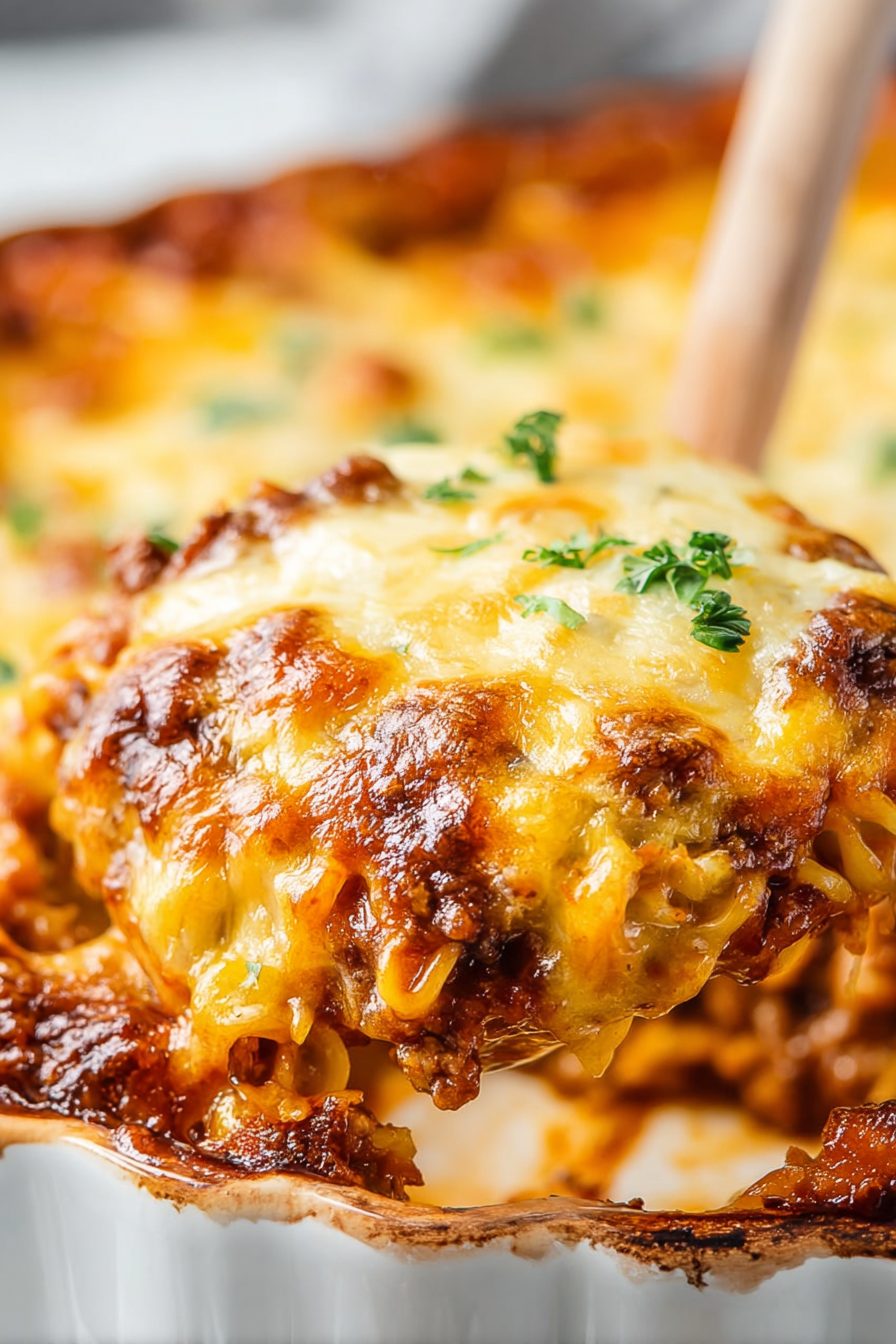 This casserole is the sloppy joe you remember from childhood, turned into a cozy, cheesy bake that feeds a crowd and cleans the plate. Think saucy ground beef (or turkey), a little kick of tomato-y sweetness, melty cheese, and a crunchy top that soaks up the juices — all baked together so you can wander off and ignore it for a hot minute. It’s comfort food with zero fuss and maximum leftovers.