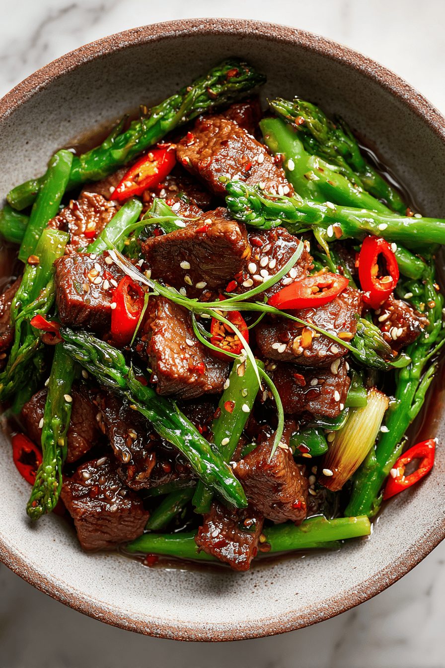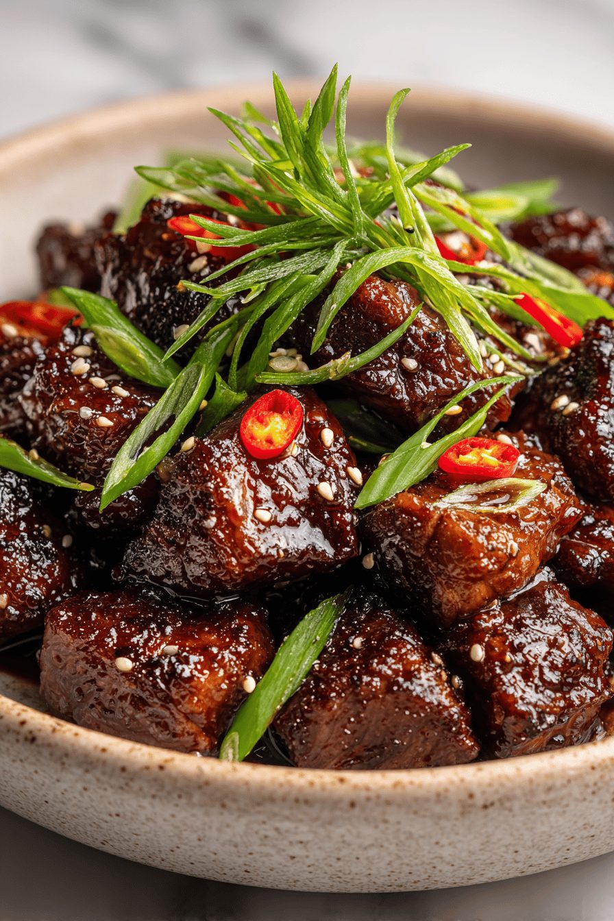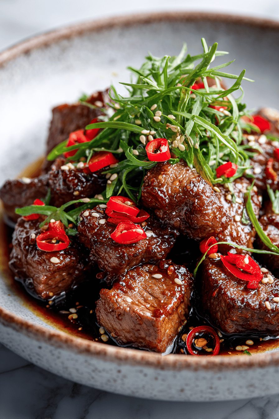 This skillet dinner is quick, a little saucy, and somehow wildly addictive — thin-cut steak bites tossed in a sticky Asian-style glaze with garlic, ginger, scallions, and a pop of sesame. It’s the kind of thing that feels restaurant-y but comes together in under 30 minutes, perfect for when you want something impressive without acting like you live in a sous-vide cult.