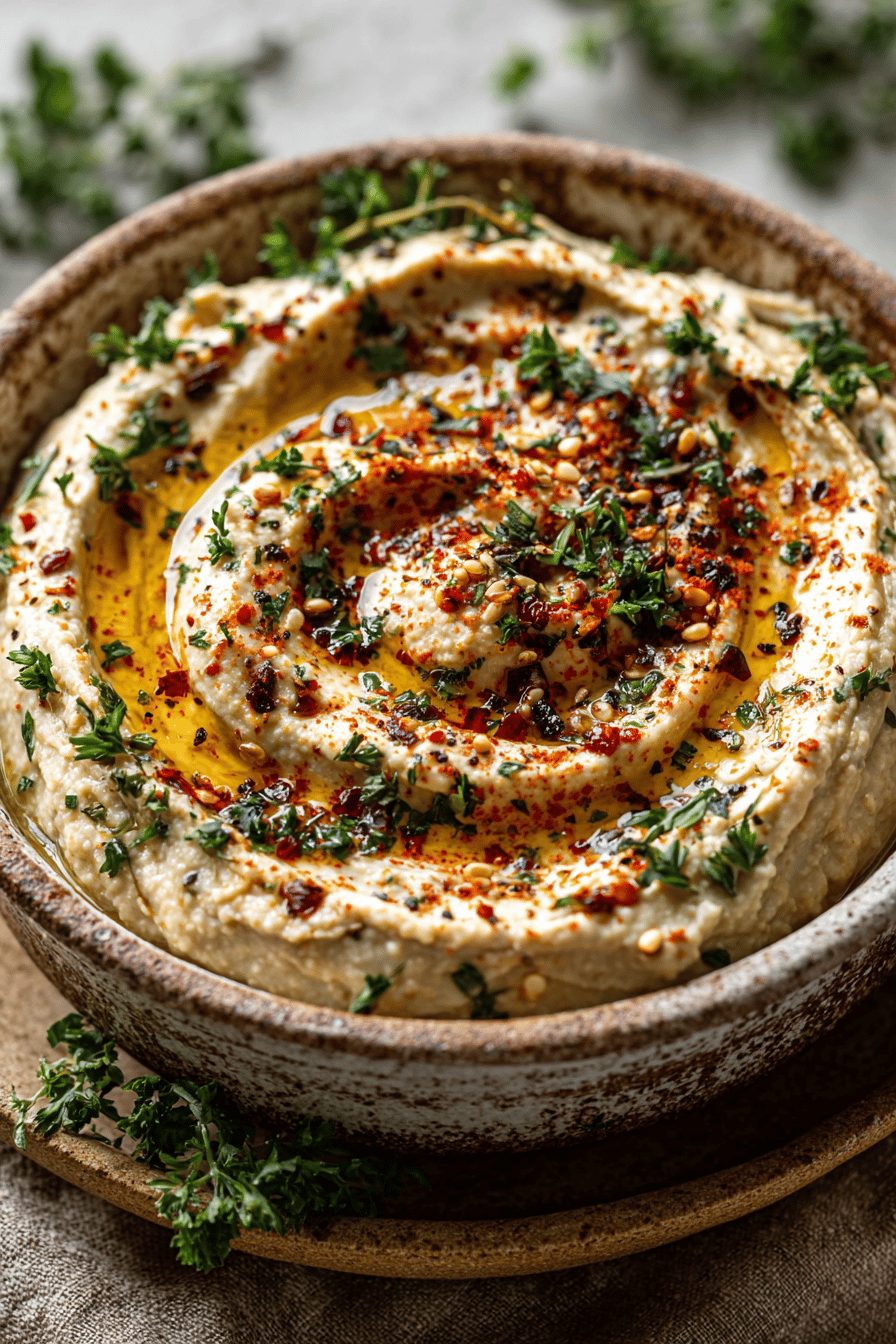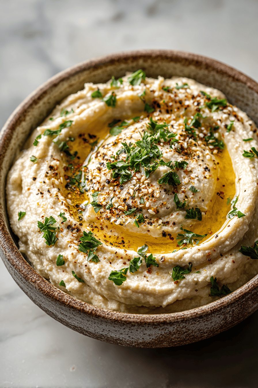 - Taste and adjust salt or lemon. Swirl into a bowl, drizzle a little oil, and top with parsley.