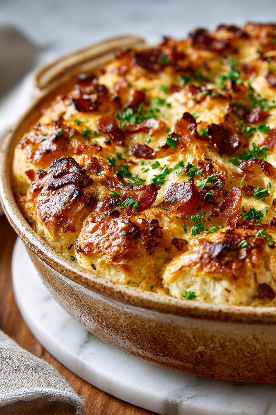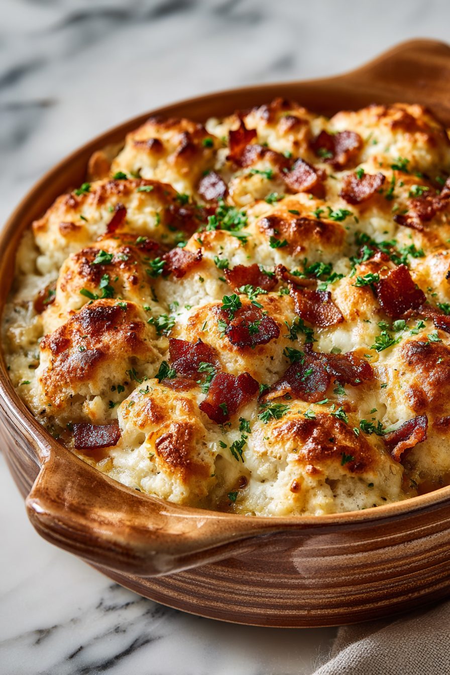 I messed up the first attempt by layering the biscuits like I was arranging wedding flowers — unnecessary perfectionism. Then I scooped everything into the pan like I was making lasagna for toddlers and it turned out better. I also once used maple-cured bacon because why not, and the sweet-salty thing was a revelation. If you’re in a hurry, don’t overthink the biscuit arrangement; the casserole forgives a messy top layer and still comes out golden and delicious.