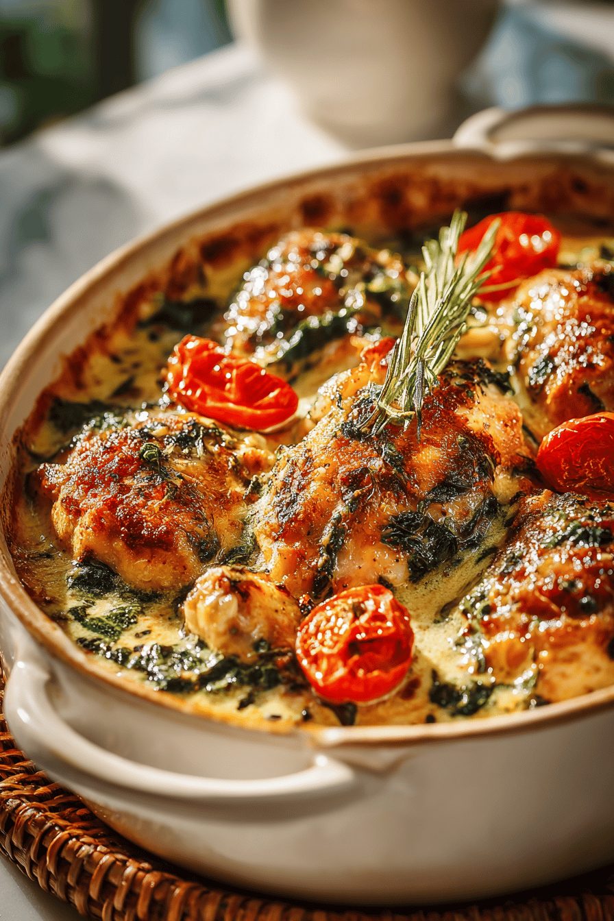 If you like creamy, garlicky, slightly tangy chicken that makes your kitchen smell like you actually know what you’re doing, this is the one. It’s baked (no pan-splattering stovetop shenanigans), saucy without being soupy, and somehow manages to feel fancy while still being weeknight-friendly. Think tender chicken, wilted spinach, sun-dried tomato bite, a hit of Parmesan, and a sauce that begs for bread or a bed of pasta.