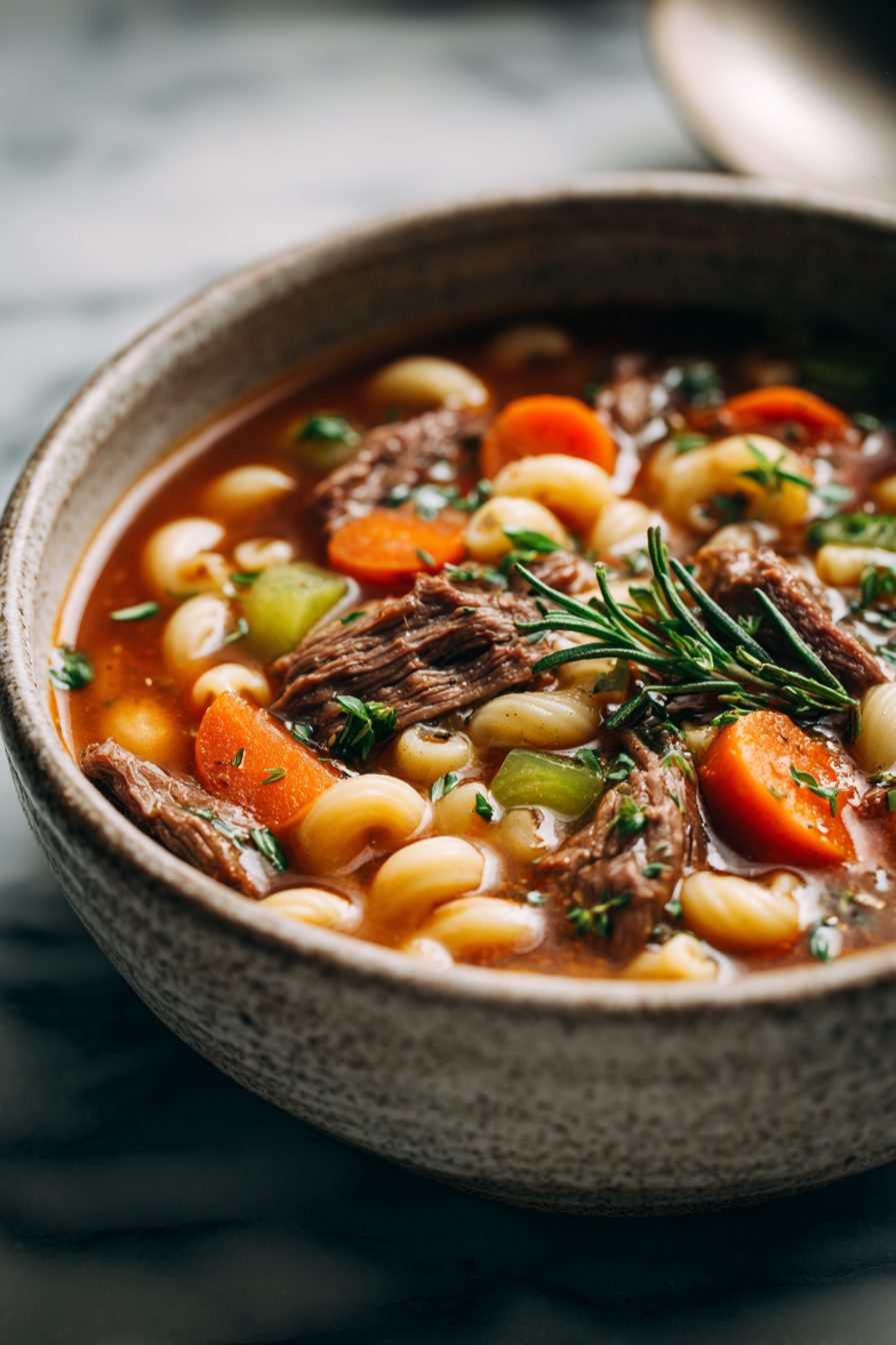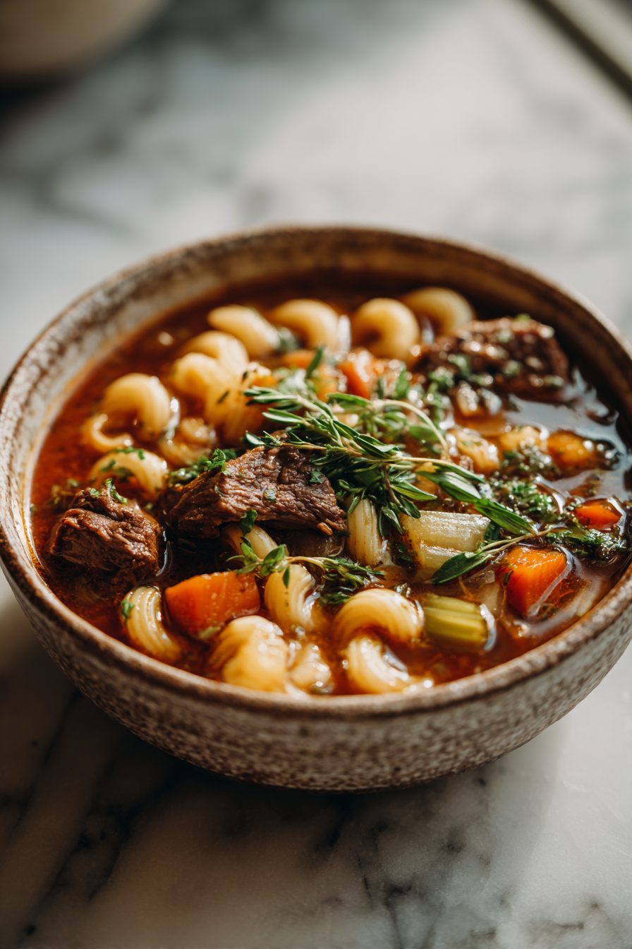 This soup is the kind of thing I make when I want dinner to feel like a hug and my stove to do the heavy lifting. It’s a cozy, beefy broth studded with macaroni, carrots, celery, and whatever pantry saviors I can wrestle into the pot — simple, comforting, and surprisingly picky-kid approved. If you need something that smells like home and disappears fast, this is it.