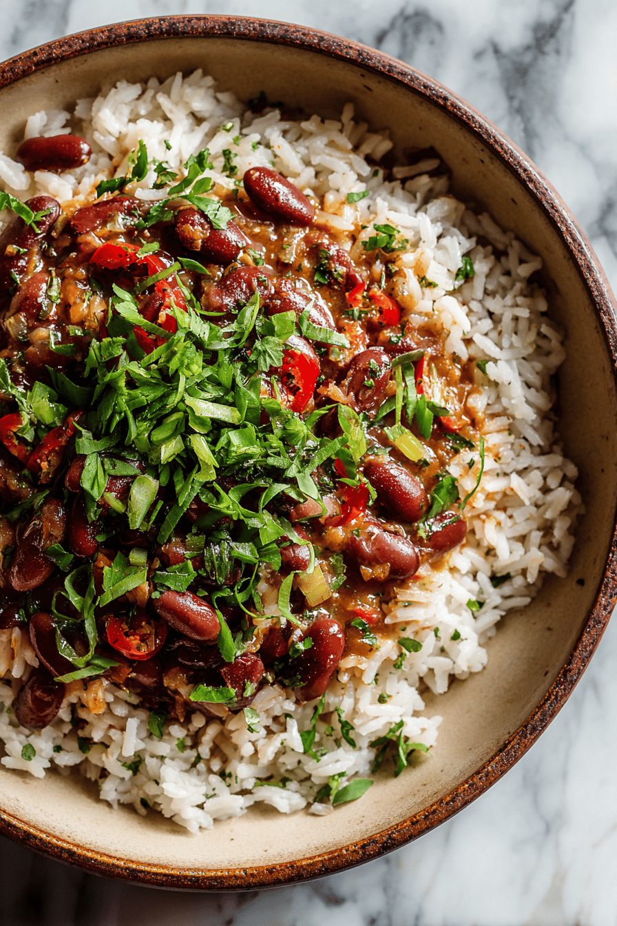 - Spoon the beans over warm rice. Garnish with parsley and green onions, and serve hot.