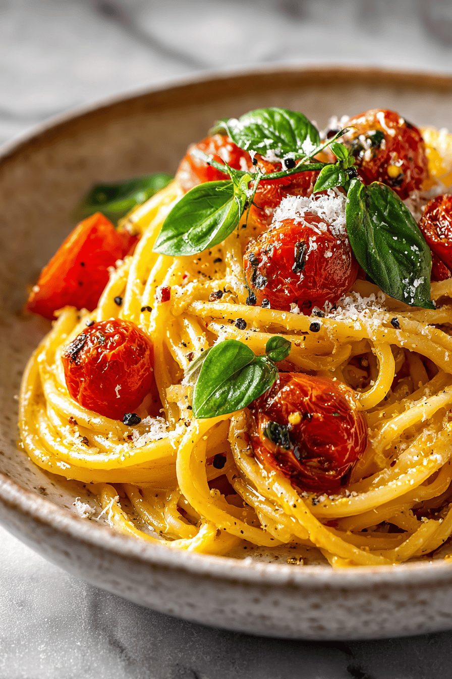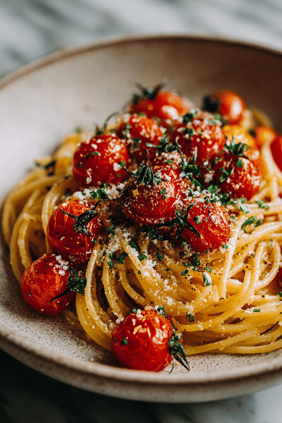 This pasta is stupid-simple but somehow feels like a tiny summer victory every time: blistered cherry tomatoes, garlic, olive oil, a splash of pasta water, and a handful of basil tossed with hot noodles until everything gets a little saucy and delicious. It’s fast, bright, and weirdly comforting — the kind of dinner you can pull together on a weeknight and still feel like you cooked something worth Instagramming (but you don’t have to).