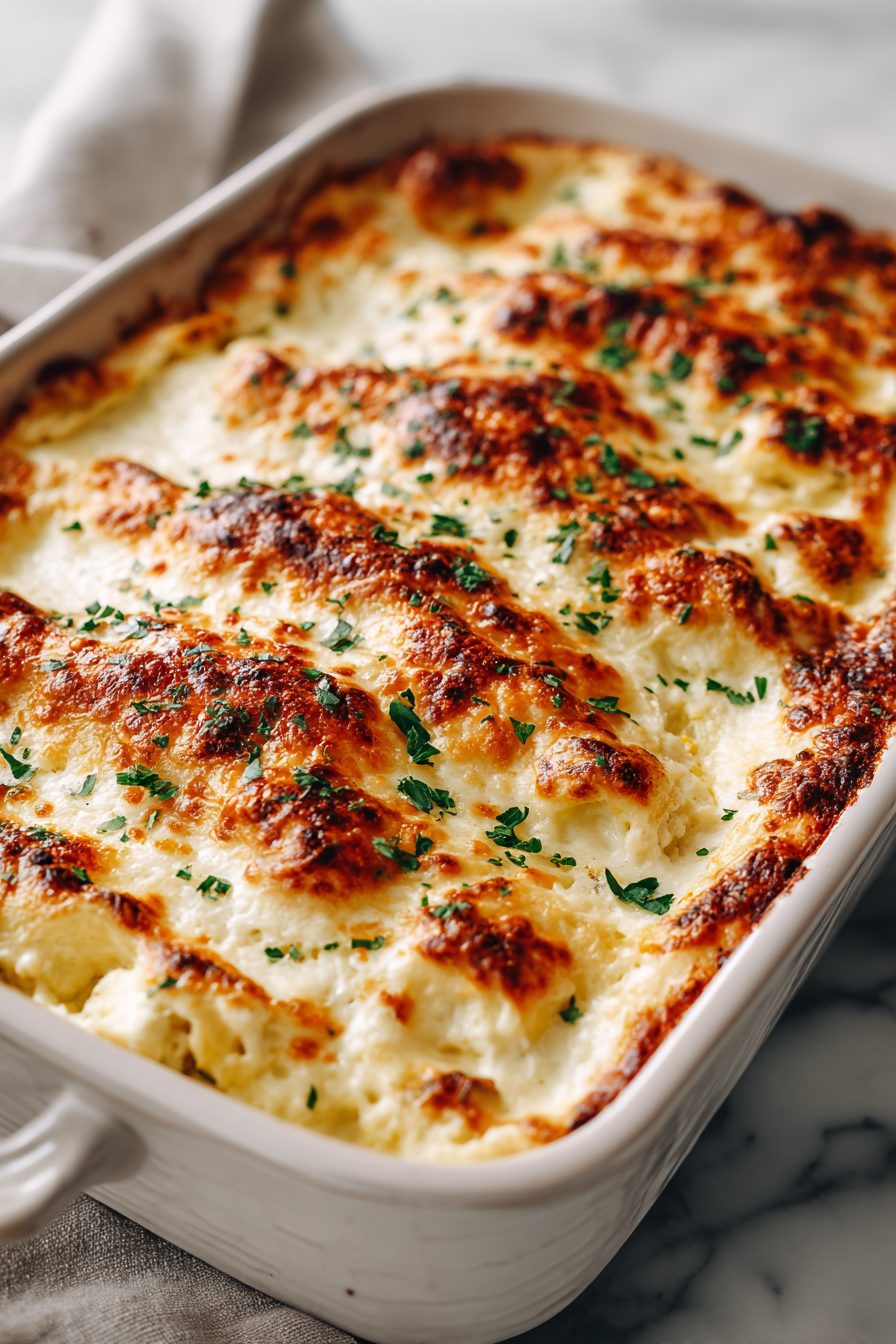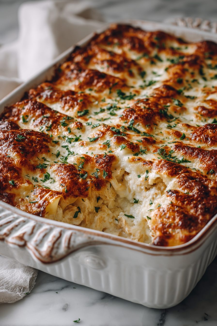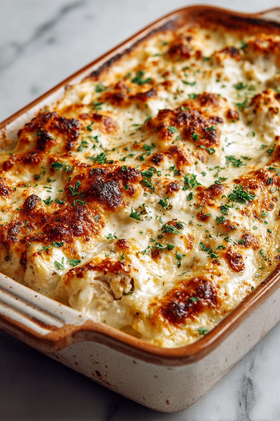 This is the kind of casserole that comforts you like an overstuffed sweatshirt: gooey ricotta + melty mozzarella wrapped inside pasta tubes, smothered in a velvety Alfredo sauce and studded with tender chicken. It feels fancy enough for company but lazy enough for a Wednesday night when you have three mismatched Tupperware lids and zero patience. It’s forgiving, saucy, and basically the pasta version of a warm hug.
