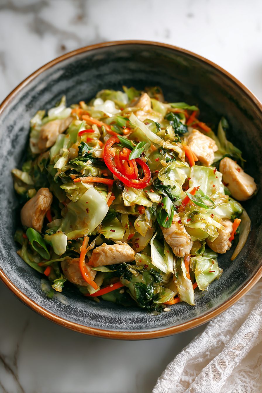 – Hot pan, quick toss: the secret to crisp cabbage and juicy chicken.