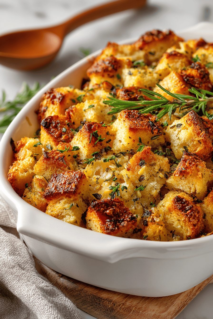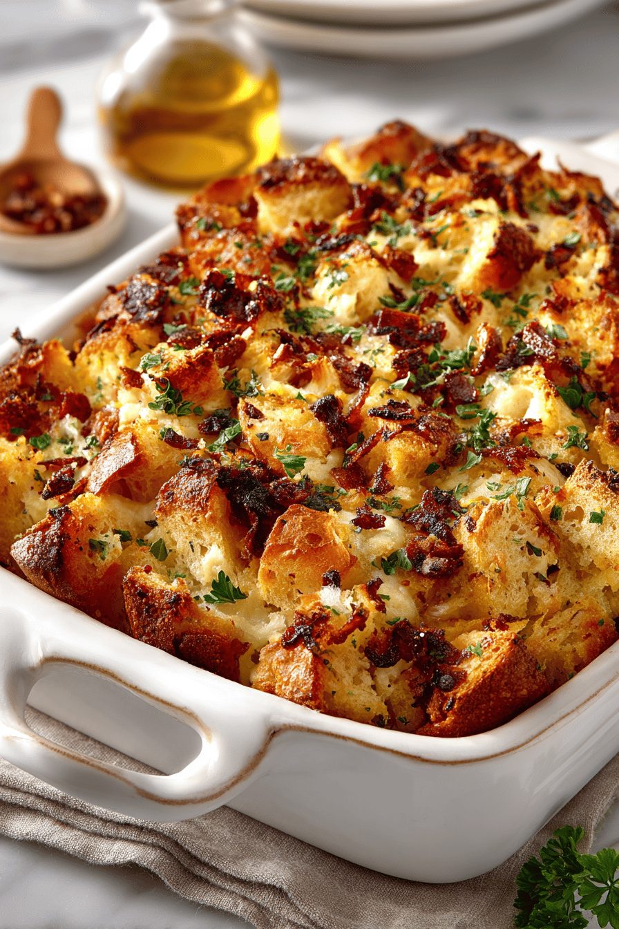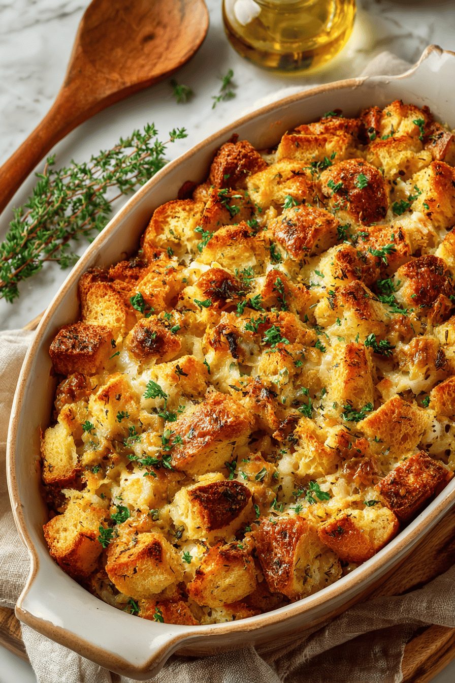 I once tried using iced, buttered bread cubes from the freezer and the casserole cried with sogginess. Lesson learned: toast or dry the bread a bit first. Another time I swapped onion for shallot because I had none, and honestly—that slightly sweet shallot made the whole thing fancier than it had any right to be. I also love stirring in a handful of frozen peas for color and a little surprise sweetness; my kids pretend it’s deliberate. Assembly is messy, comforting, and oddly therapeutic — like playing with a savory sandcastle.