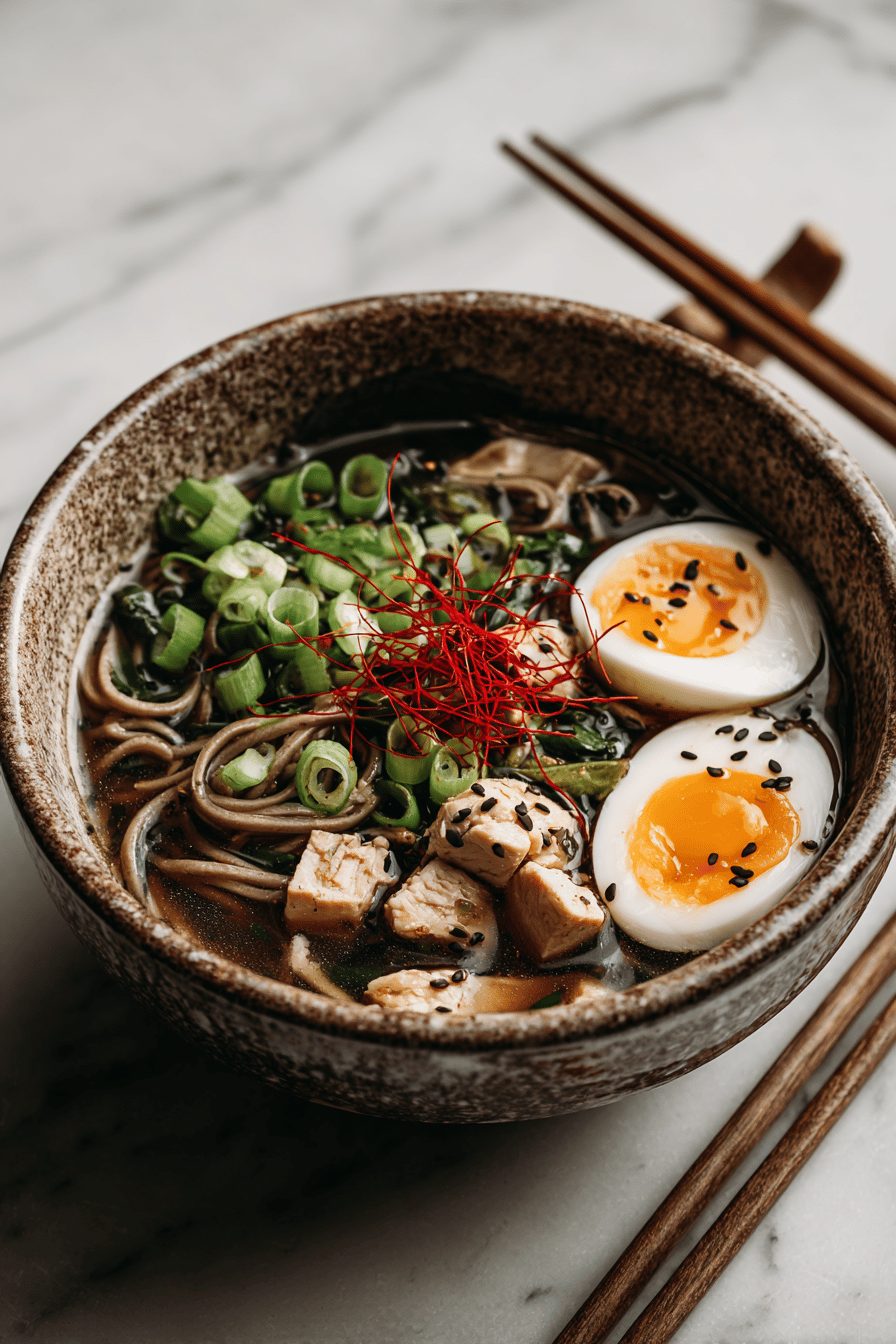 – Cook soba separately and toss into bowls, then ladle hot broth on top so noodles don’t go mushy while you finish toppings.