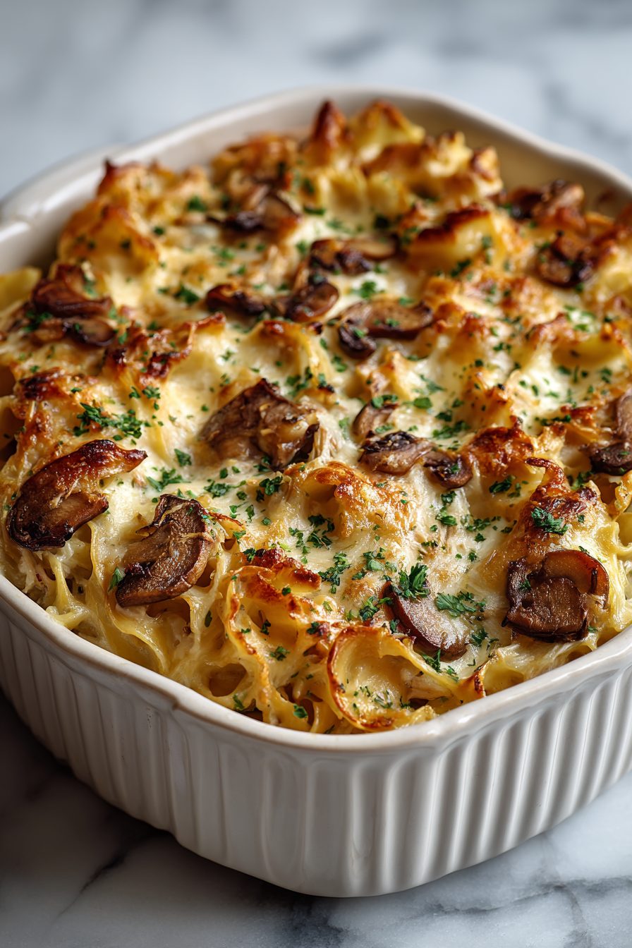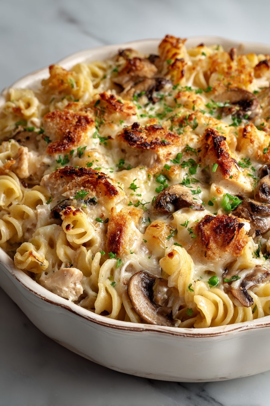 This recipe is one of those comforting chaos-makers. I learned early on that over-sautéing mushrooms makes them shrivel and forget their purpose, so I cook them till they just lose their raw edge. I also once forgot to salt the pasta water and had to dump a salty cheese on top to compensate — it looked ridiculous and tasted fine, but don’t be me. Substituting rotisserie chicken for the roasted breast saved my sanity on more than one busy night. Also, if your sauce seems thin, let it rest 5–10 minutes after baking — it firms up and becomes spoonable-not-soupy.