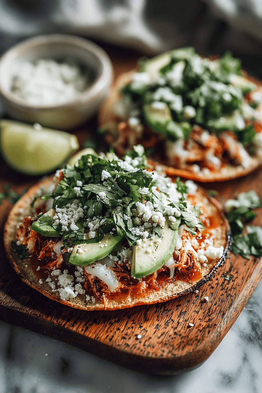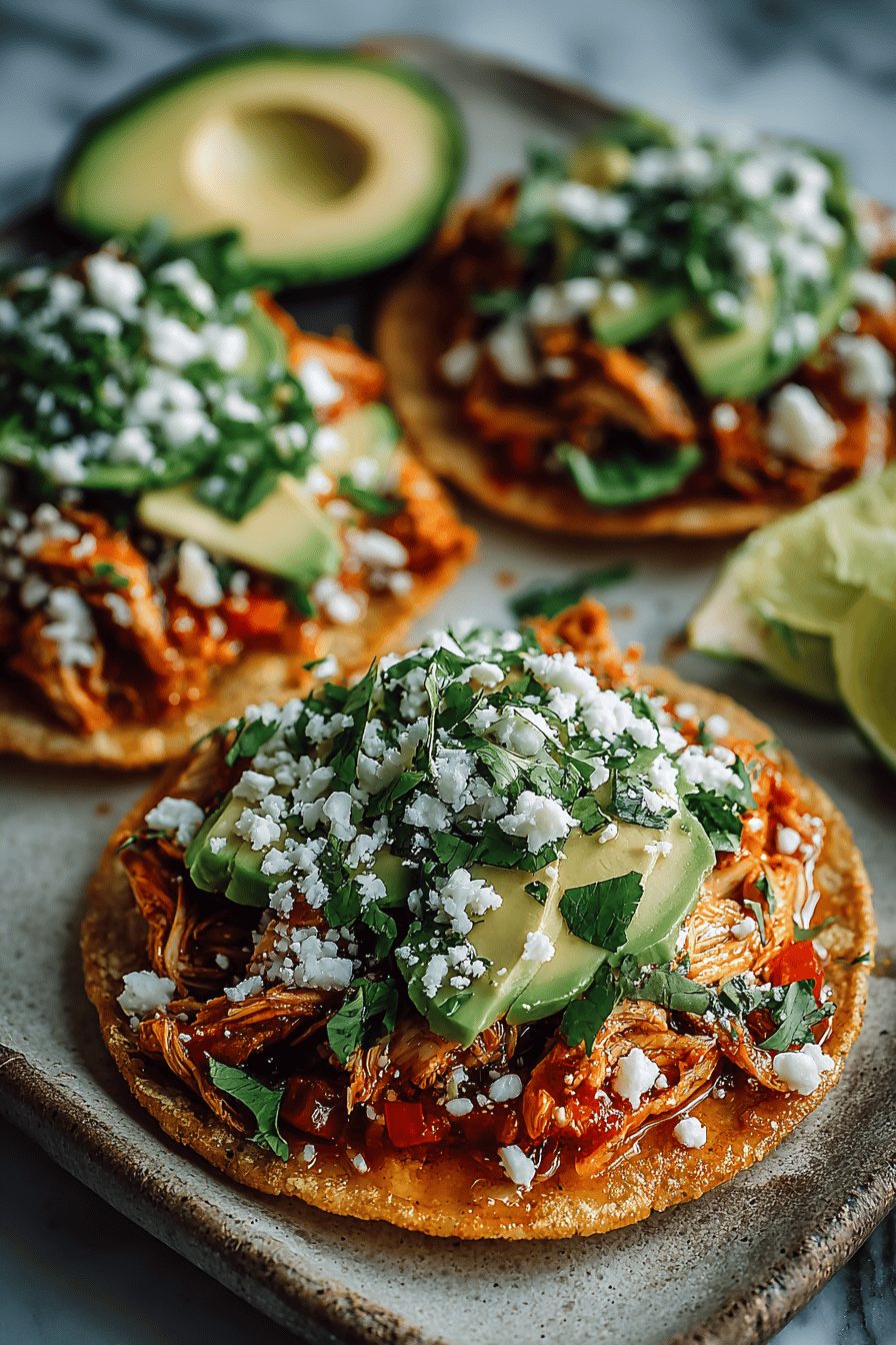 I learned early that tostadas are basically a mood, not a strict formula. Some nights I simmer the chicken low and slow with ancho and cumin; other nights I shred rotisserie chicken and toss it with a pan sauce and call it a win. I once tried frying the tortillas and got a blistered-but-gorgeous batch that tasted like nacho chips gone classy. Also: pickled red onions are a small commitment that pays back in flavor dividends — do not skip if you can help it.