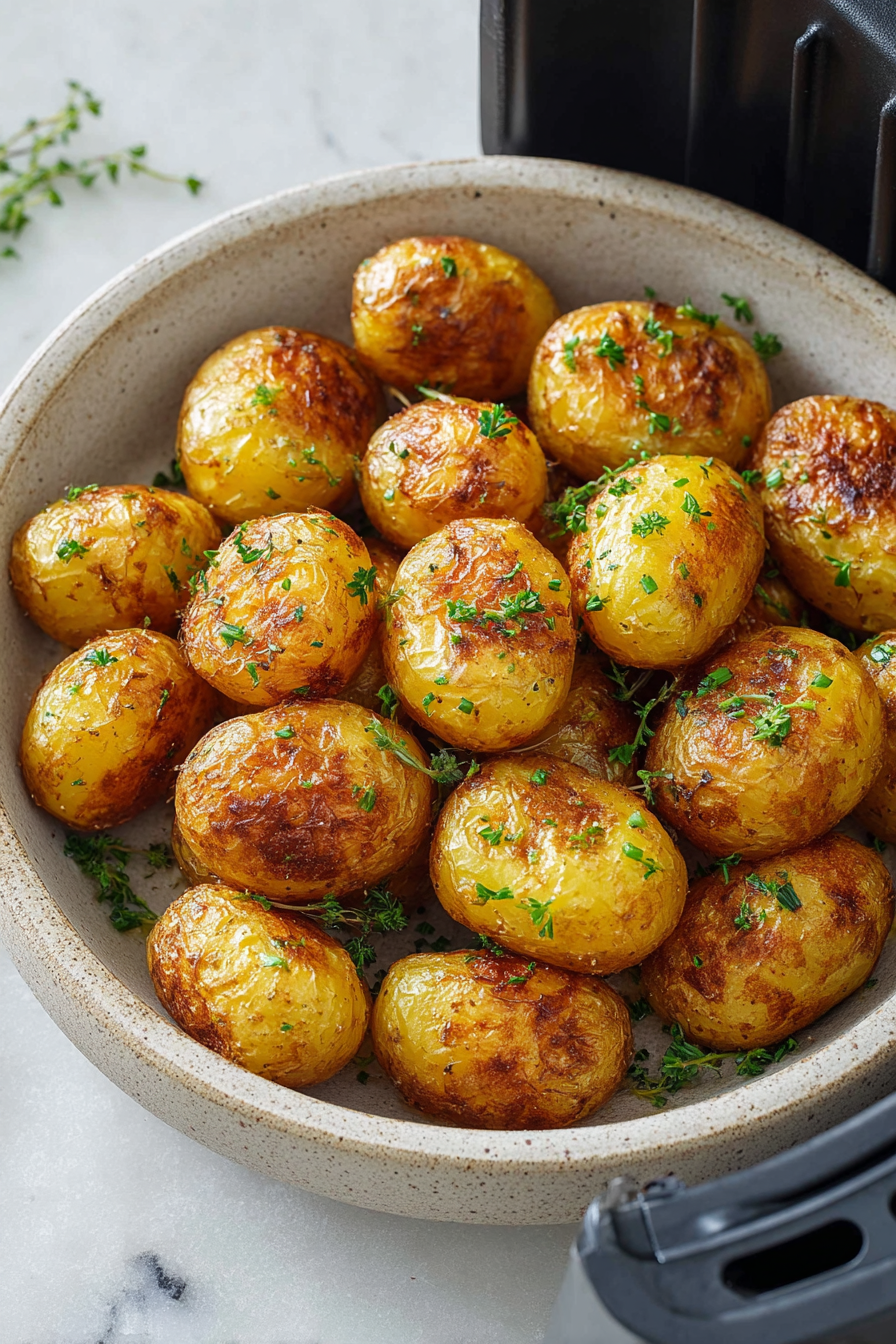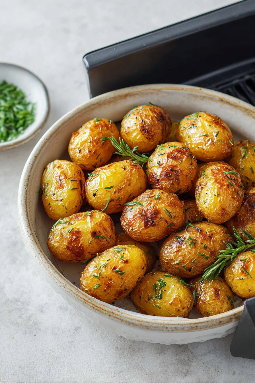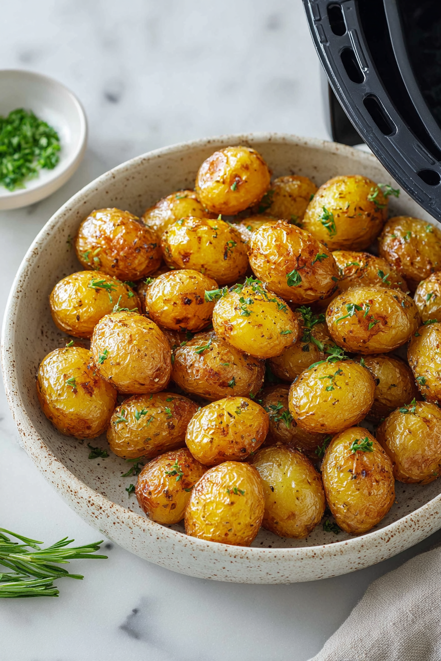 These little golden baby potatoes are the crispy-side I make when the clock says 6:17 and everyone is suddenly starving and loud. They’re bitey and salty and a little herby, with that shattery outside and fluffy, steamy middle that makes you burn your tongue and still go back for more. The air fryer does all the heavy lifting, so you get weeknight speed with weekend-level crunch.