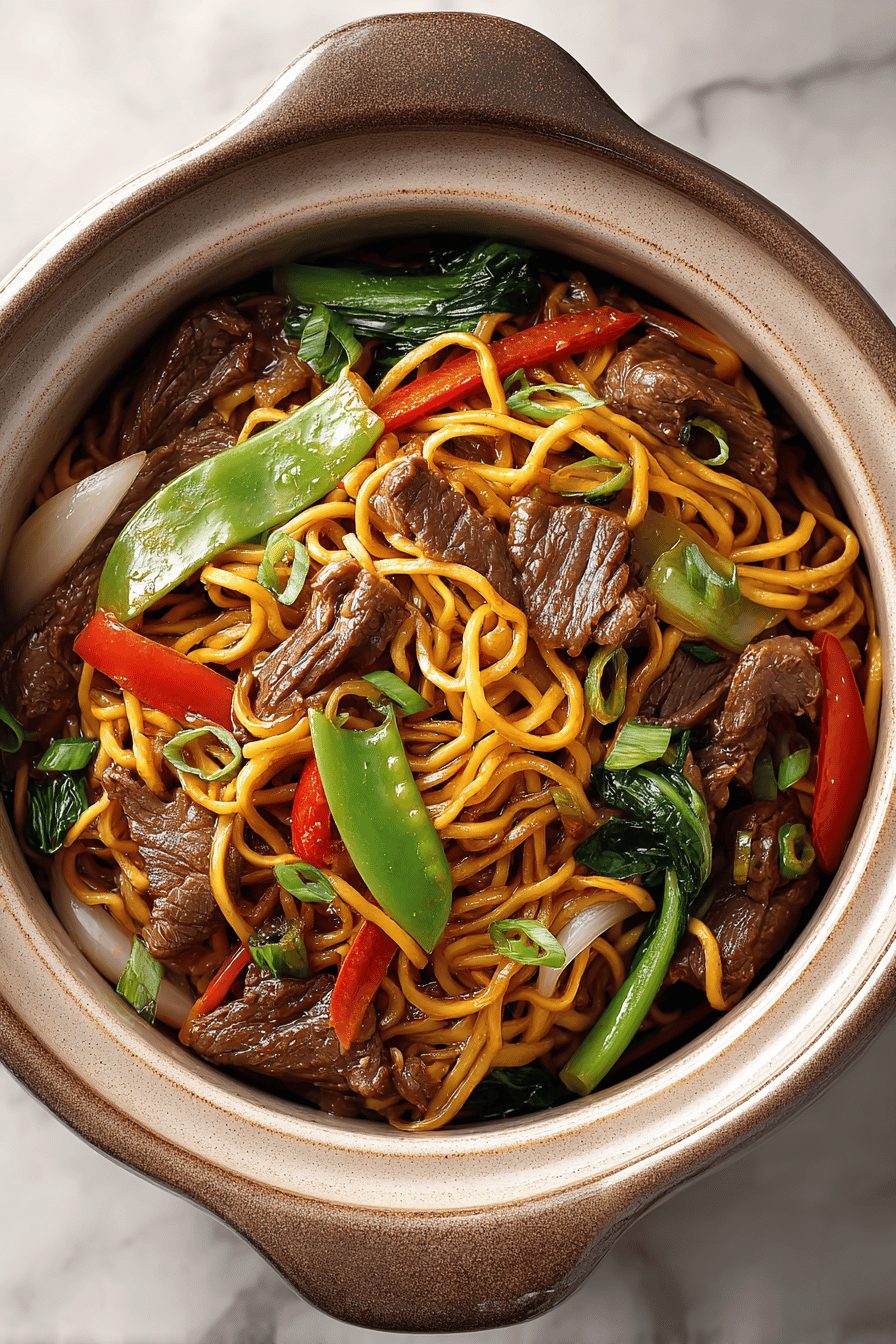 I make this Easy Crockpot Lo Mein when I want takeout vibes without the takeout guilt or the delivery wait, and honestly it’s become the kitchen shortcut I brag about and then quietly panic about when guests show up. It’s goofy — noodles, veggies, sauce, and whatever protein you’ve got tossed in a slow cooker until everything smells like heaven and your house suddenly feels like a Chinese restaurant that forgives you for wearing sweatpants.