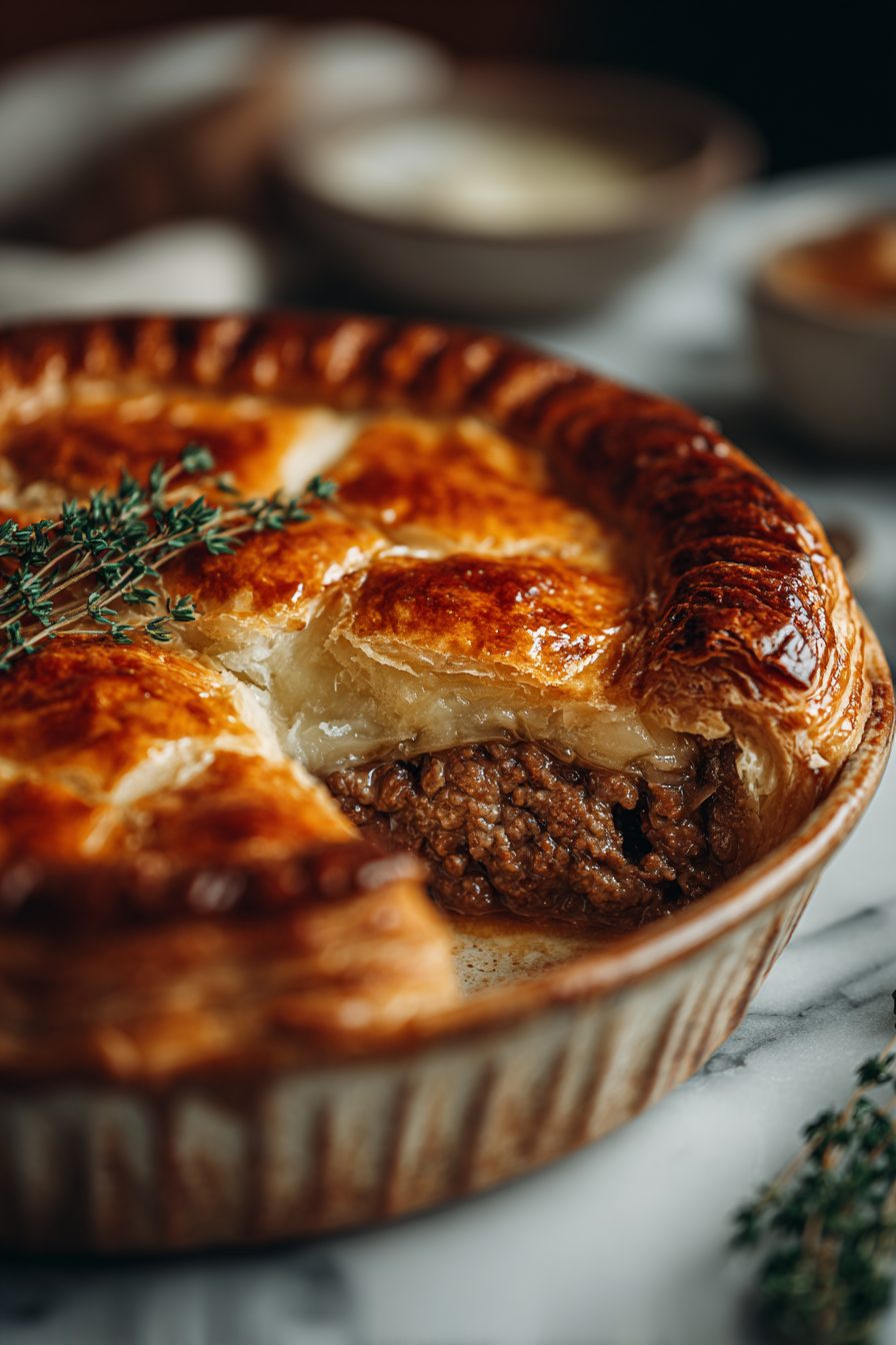This savory, flaky French-style meat pie is the kind of thing that looks fancy but is stubbornly easy — ground meat browned with onion, garlic, herbs and a little cream or stock, tucked into buttery pastry and baked until the top is golden and the edges sing. It’s comfort food with a shrug: cozy enough for Sunday, impressive enough for company, and forgiving when you forget to buy that one fancy ingredient.