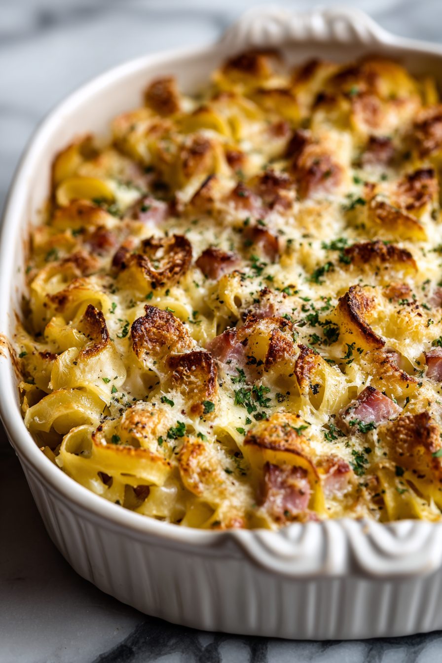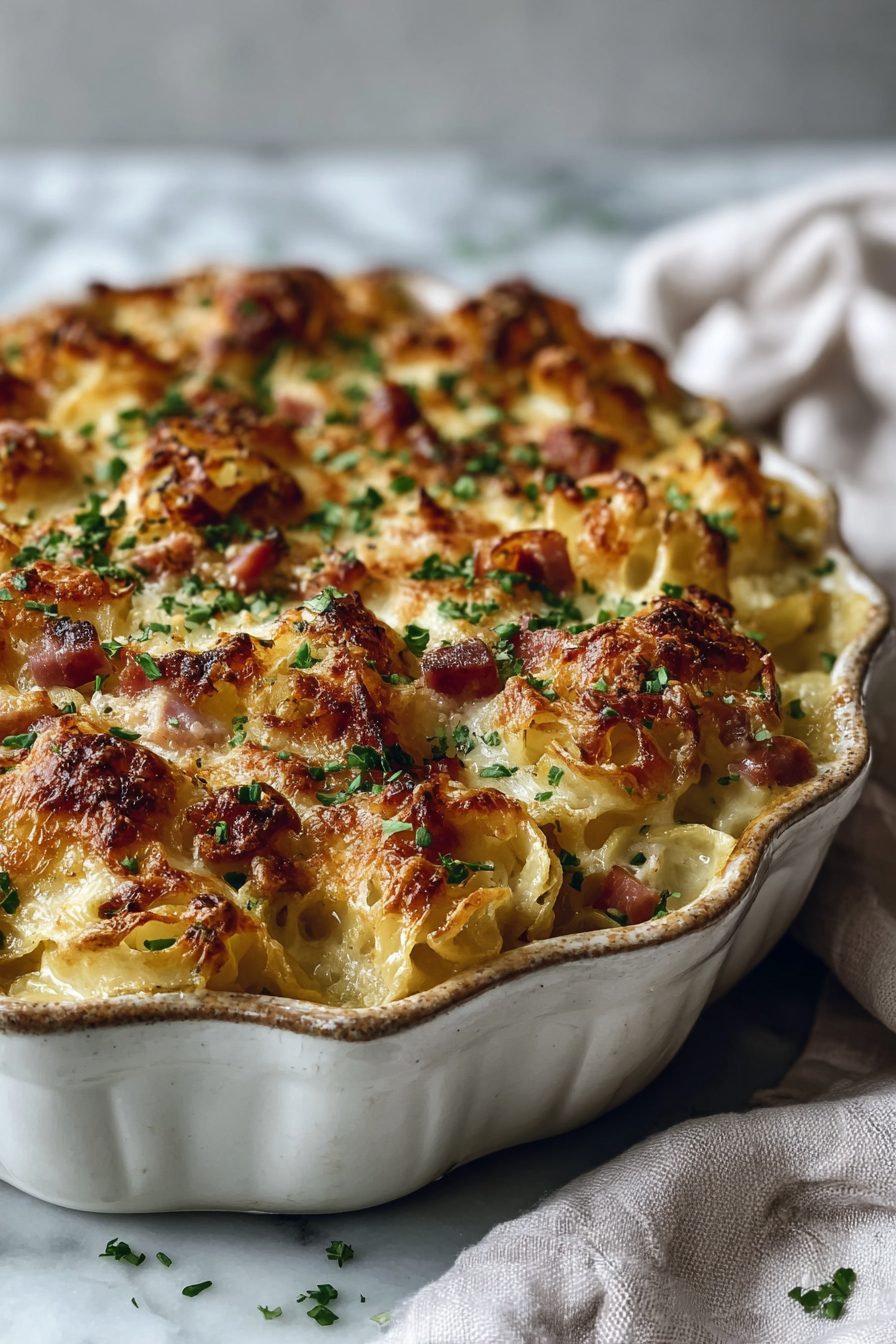 This is the kind of cozy, stupidly simple casserole that shows up when life is chaotic and I need dinner to behave. It’s buttery noodles tangled with salty ham and a cheesy, dreamy sauce — the kind of meal that disappears before you even remember to take a photo. Comfort food without fuss, perfect for using leftover holiday ham or the deli slices nobody asked for.