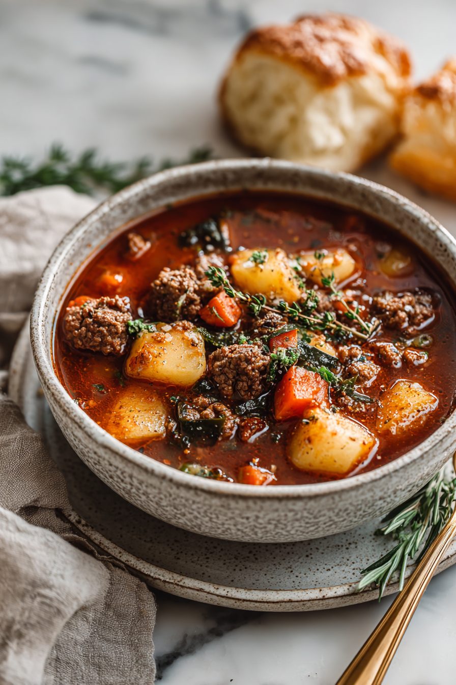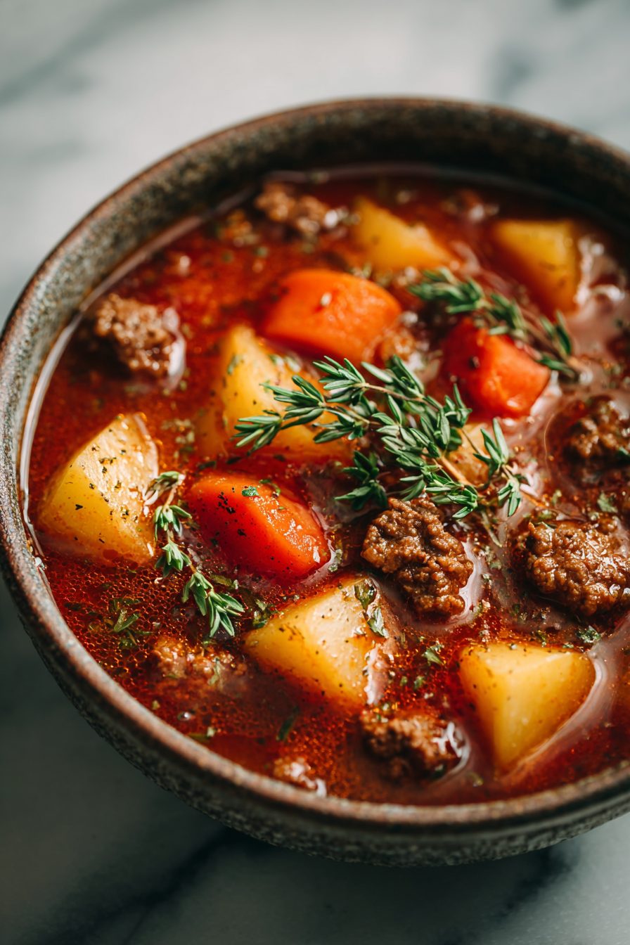 This stew is the kind of dinner that makes the whole house inhale a little louder — saucy, beefy, and stupidly comforting. It’s basically browned ground beef simmered with tomatoes, broth, veggies and a handful of pantry tricks so it tastes like you simmered it all day, even though you didn’t. Perfect for nights when you want cozy without the fuss.