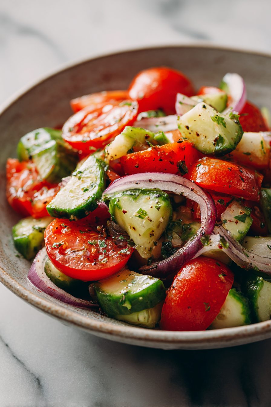 – Vegetables: Pick firm tomatoes and cucumbers — they add crunch and won’t turn the salad watery after an hour.
