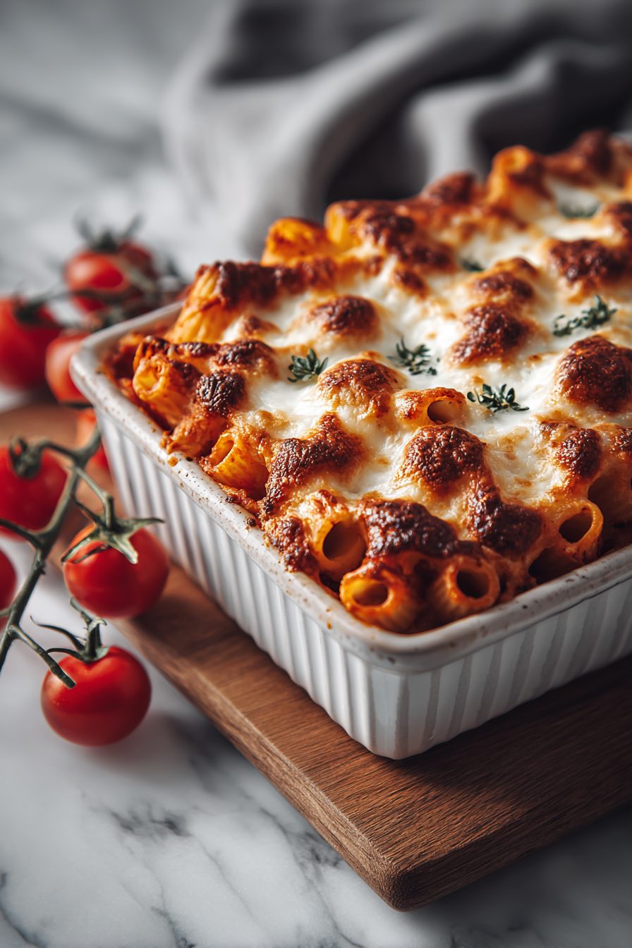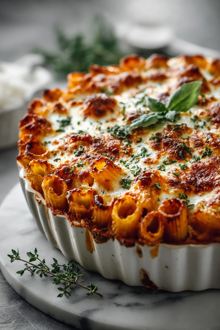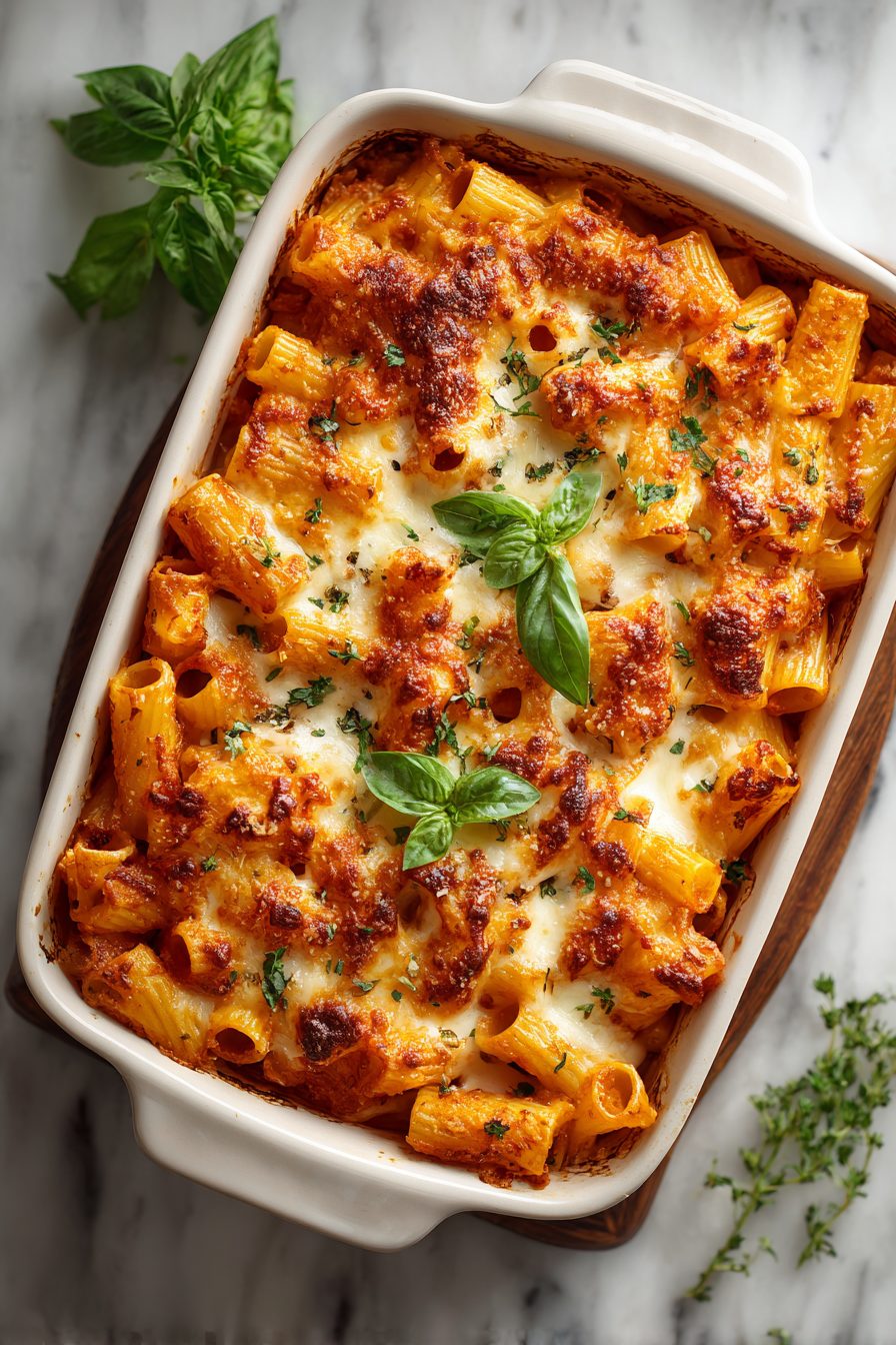 This baked rigatoni is the kind of cozy, sloppy, tomato–cheesy comfort food that will have you scraping the dish with a spoon and calling it dinner for the next three days. It’s got a lazy-cooked marinara, browned sausage (or a veg swap), big chewy rigatoni that holds sauce in its ribs, and a ridiculous crown of melty, blistered cheese on top. Basically, it’s forgiving, crowd-pleasing, and perfect for nights when you want something hearty without pretending you’re a professional.