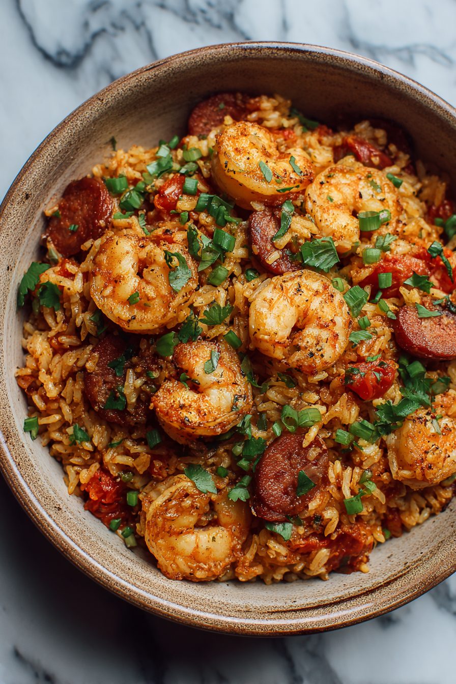 This jambalaya is my kind of comfort — smoky sausage, a little heat, tender chicken, and juicy shrimp all cozying up to rice that soaks up every spicy-soupy drop. It’s messy, bold, and forgiving: great for feeding a hungry crew or pretending you know what you’re doing when guests pop by. If you like food with personality (and a fork that can handle sauce), try this.