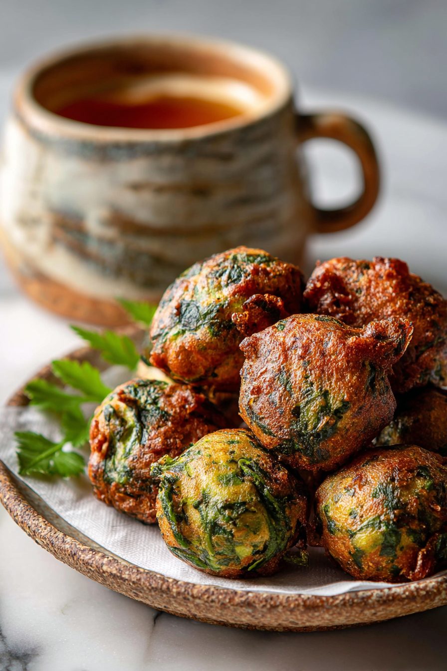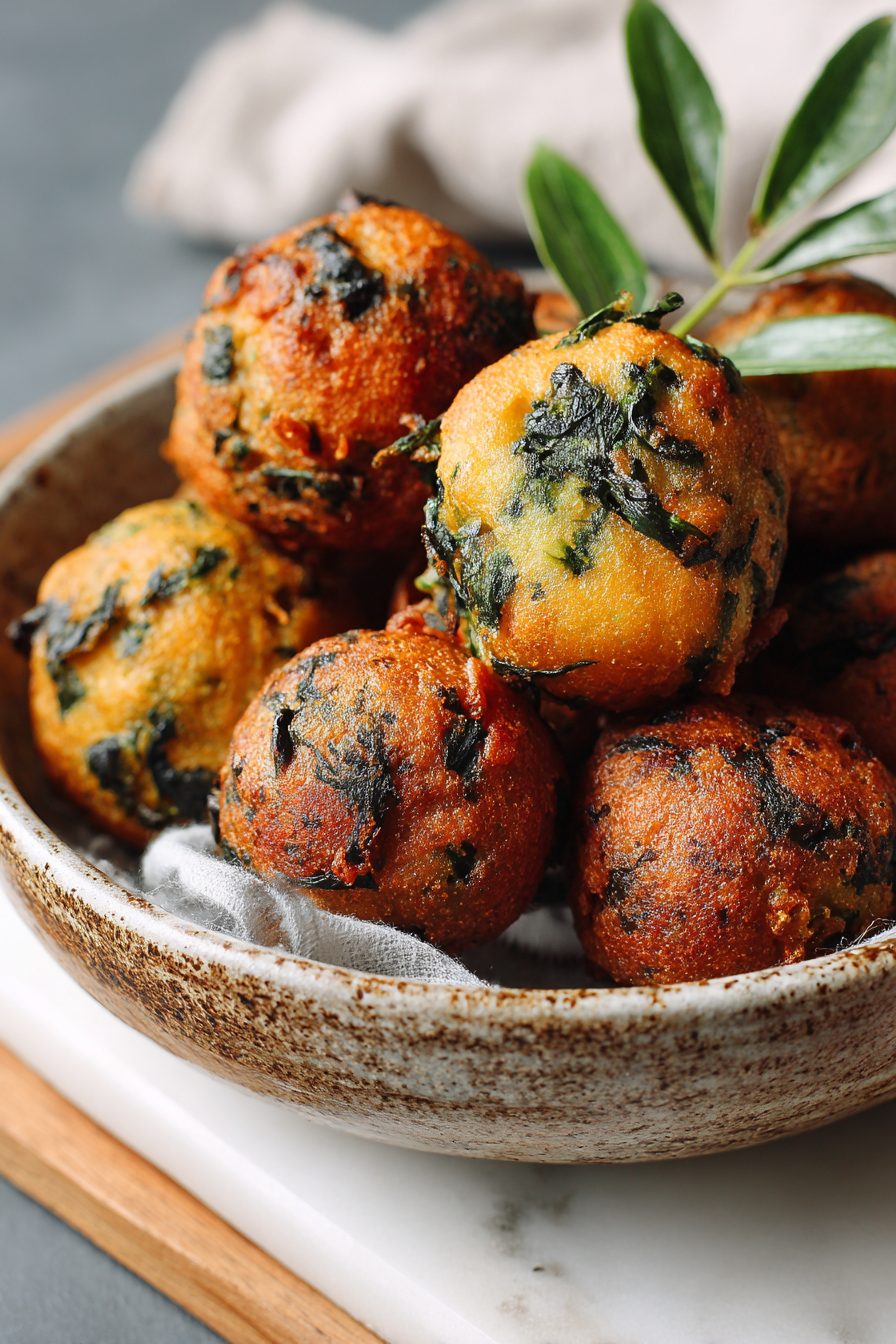 This is one of those gloriously messy little fritters that somehow fixes everything: wilted spinach gets chopped, mixed with spiced gram-flour batter, and fried until the edges are crackly and golden. It’s crunchy, green, a little oily in the best way, and completely addictive — perfect for dunking in chutney or for sneaking before anyone else notices the plate is empty.