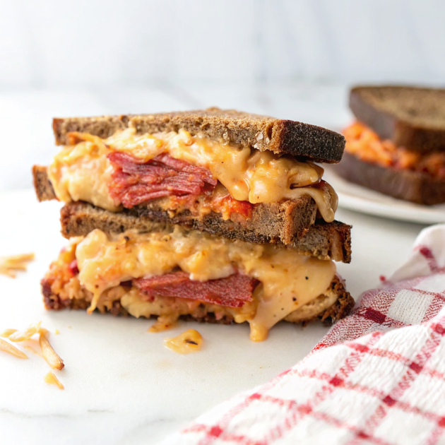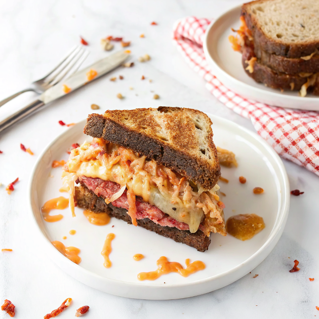 All the craveable Reuben vibes—melty Swiss, juicy corned beef, tangy-spicy sauce—brightened with crunchy kimchi. This griddled sandwich is fast, bold, and wildly satisfying.