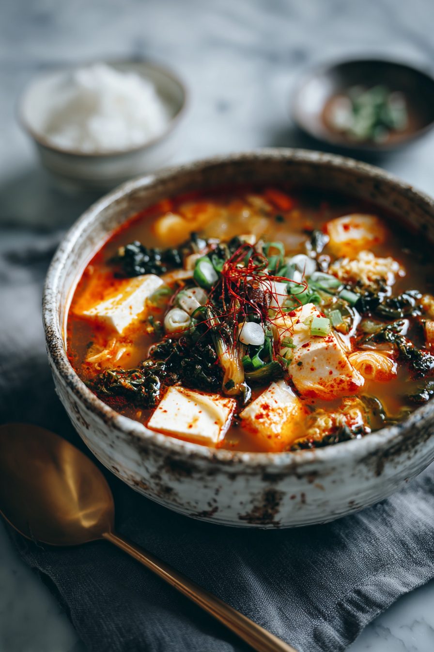 I make this soup when the world is gray and my hands need something warm to hold. It’s a simple, forgiving Korean-style winter soup — think cozy anchovy/kelp broth vibes, soft tofu, napa cabbage, a little gochujang heat, and scallions that wilt into everything like they belong there. It’s loud, comforting, and oddly humble; the kind of bowl that makes you sigh loud enough to scare the cat.